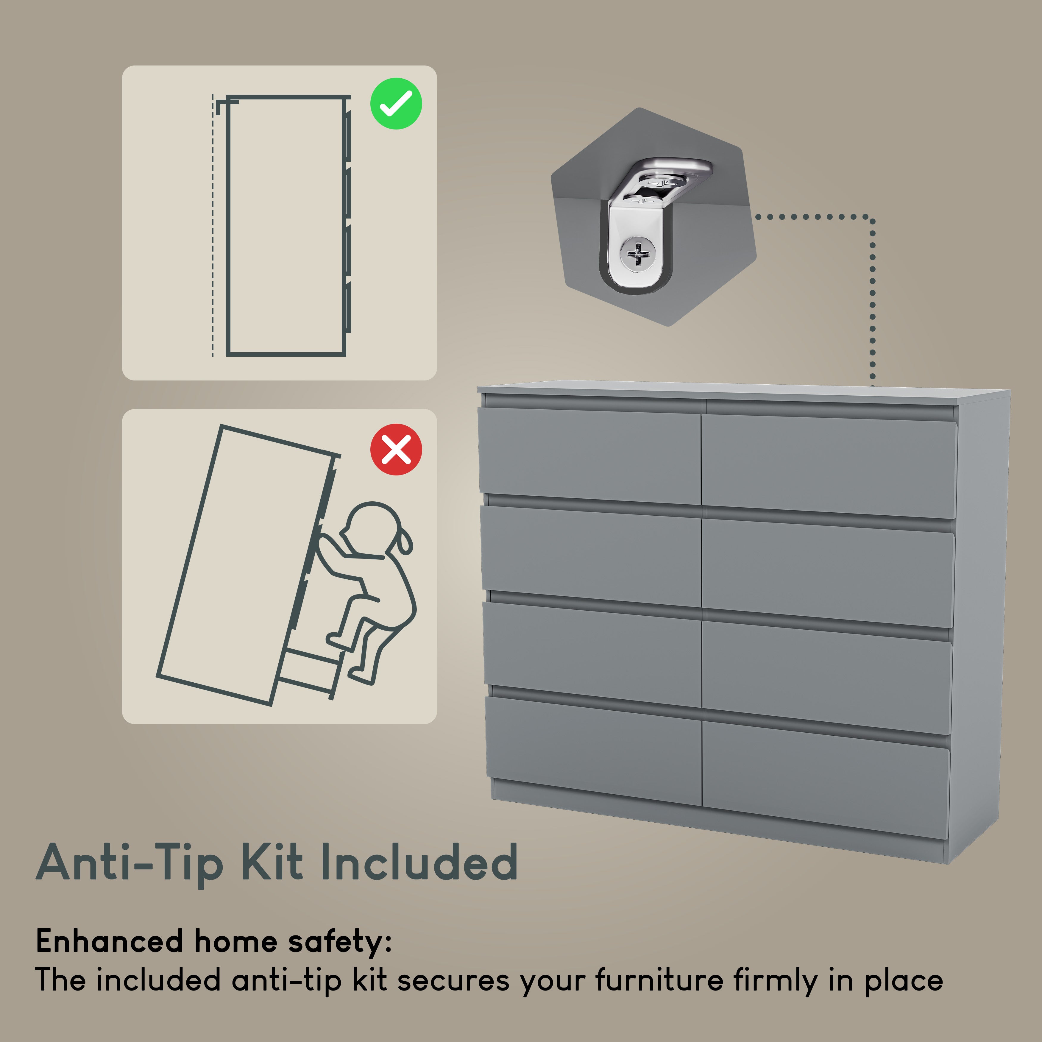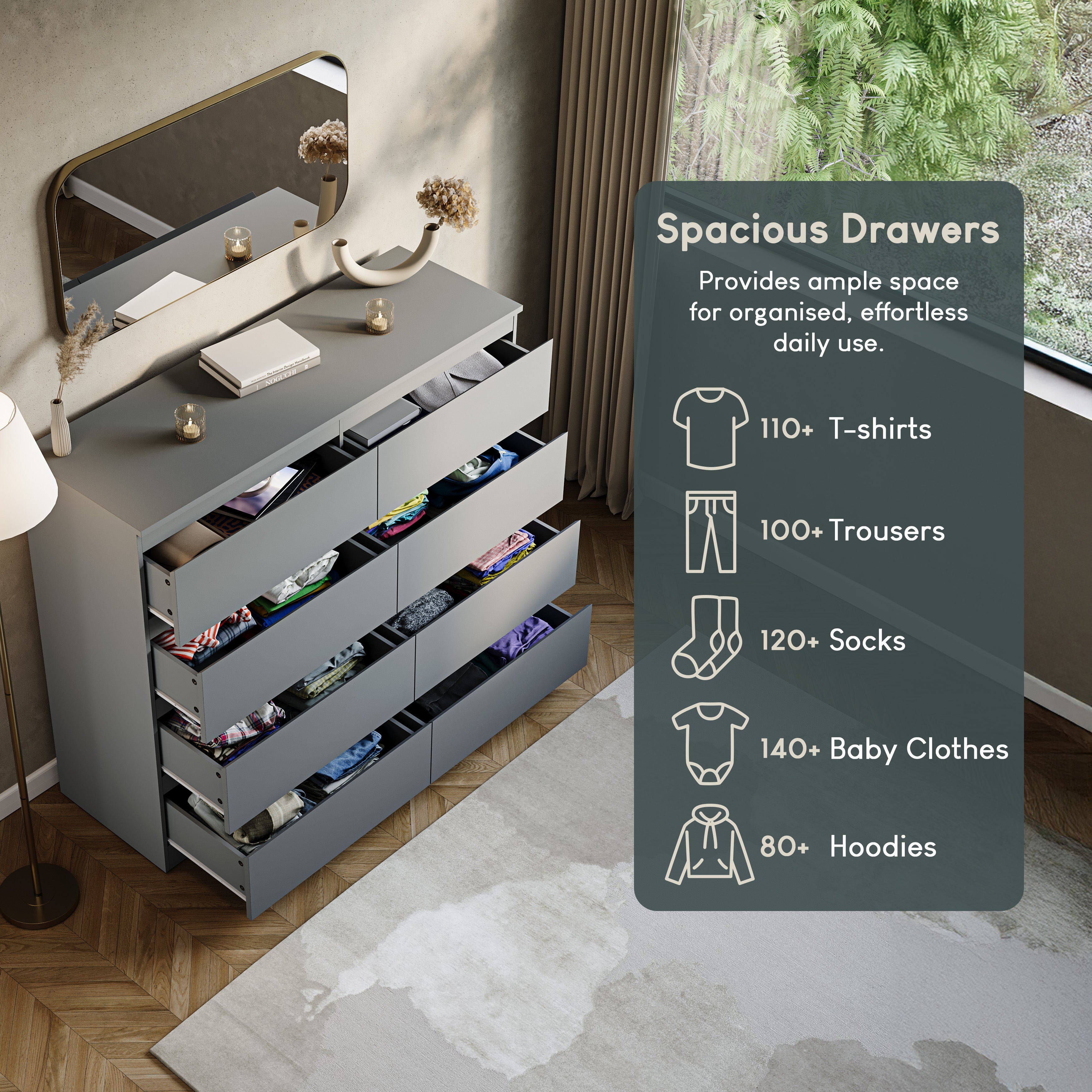 Spacious Storage: With eight spacious drawers, this chest of drawers provides ample storage space for all your essentials, keeping your bedroom or living space tidy and organized.