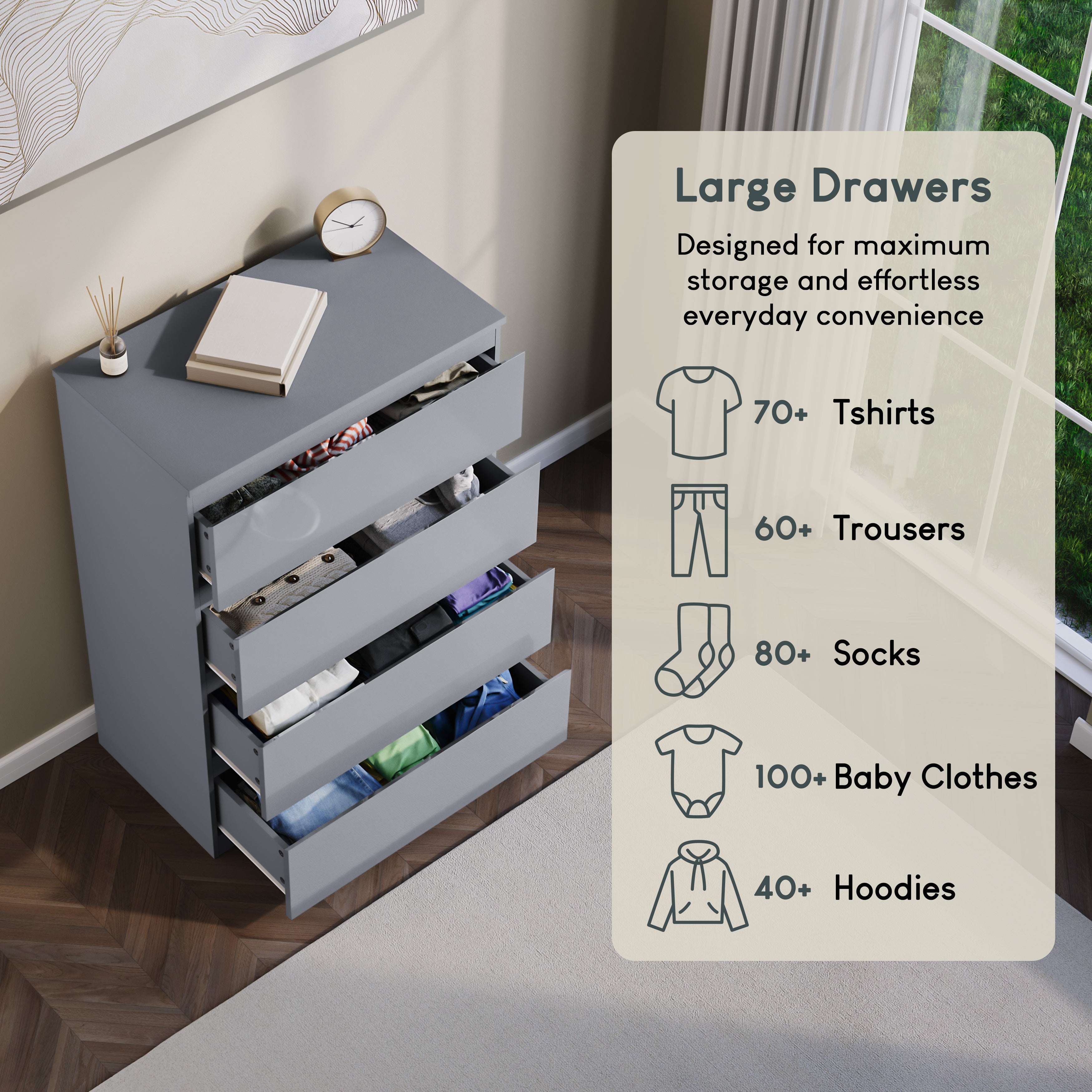Ample Storage: The chest offers four spacious drawers, providing plenty of storage for various essentials.