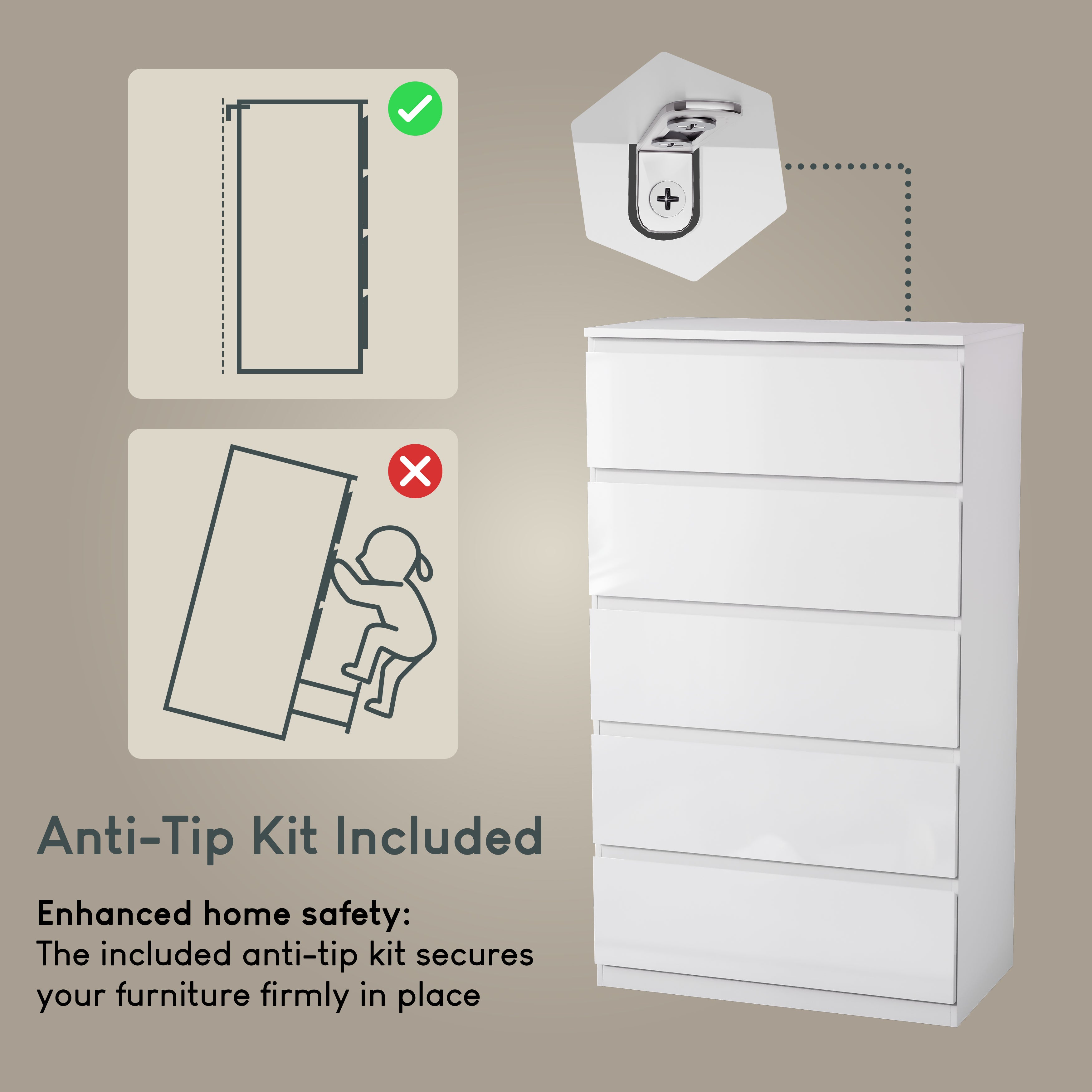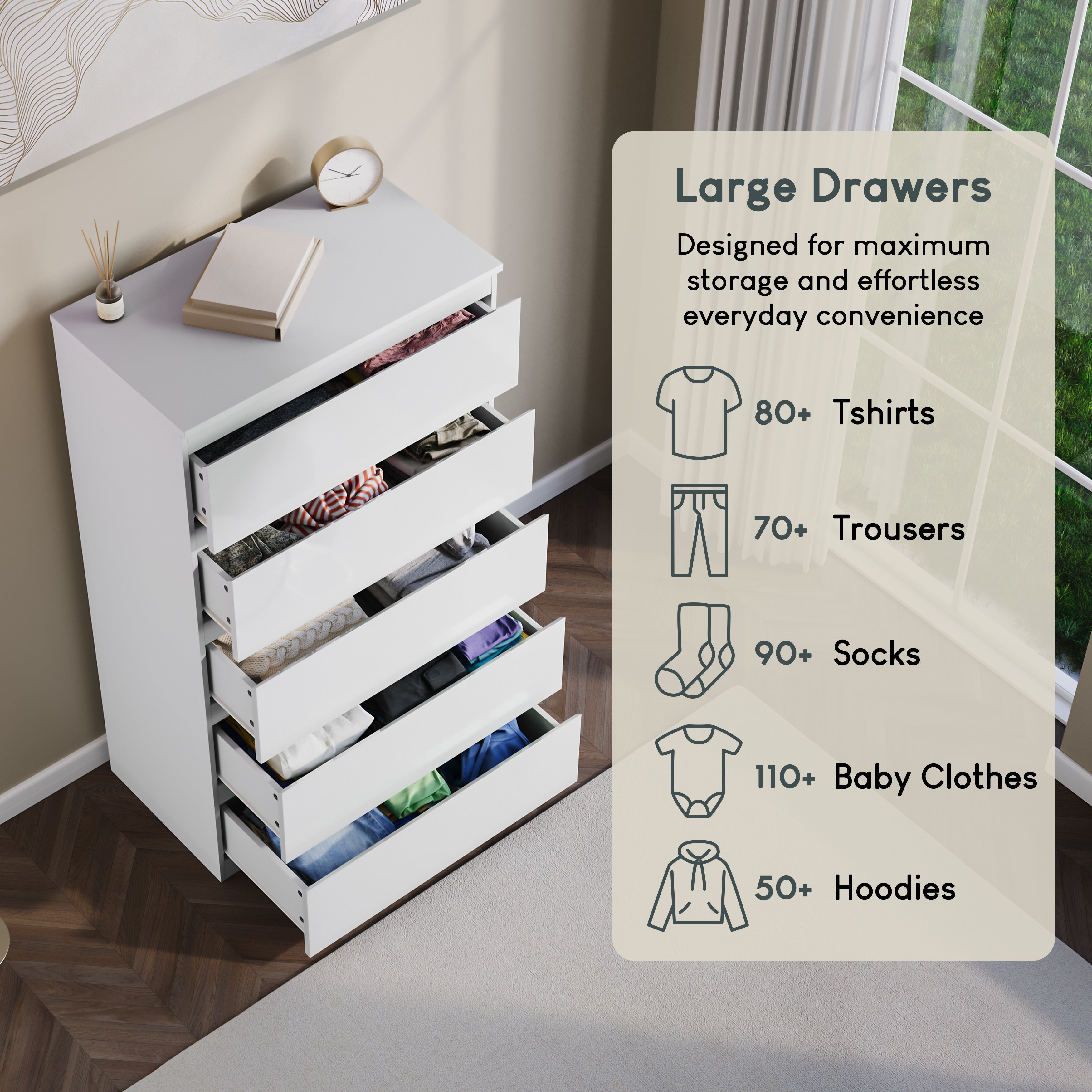 Modern Aesthetic: The Glinton 5-Drawer Chest features high gloss drawers and a matte carcass, offering a sleek and contemporary look suitable for any bedroom or living space.