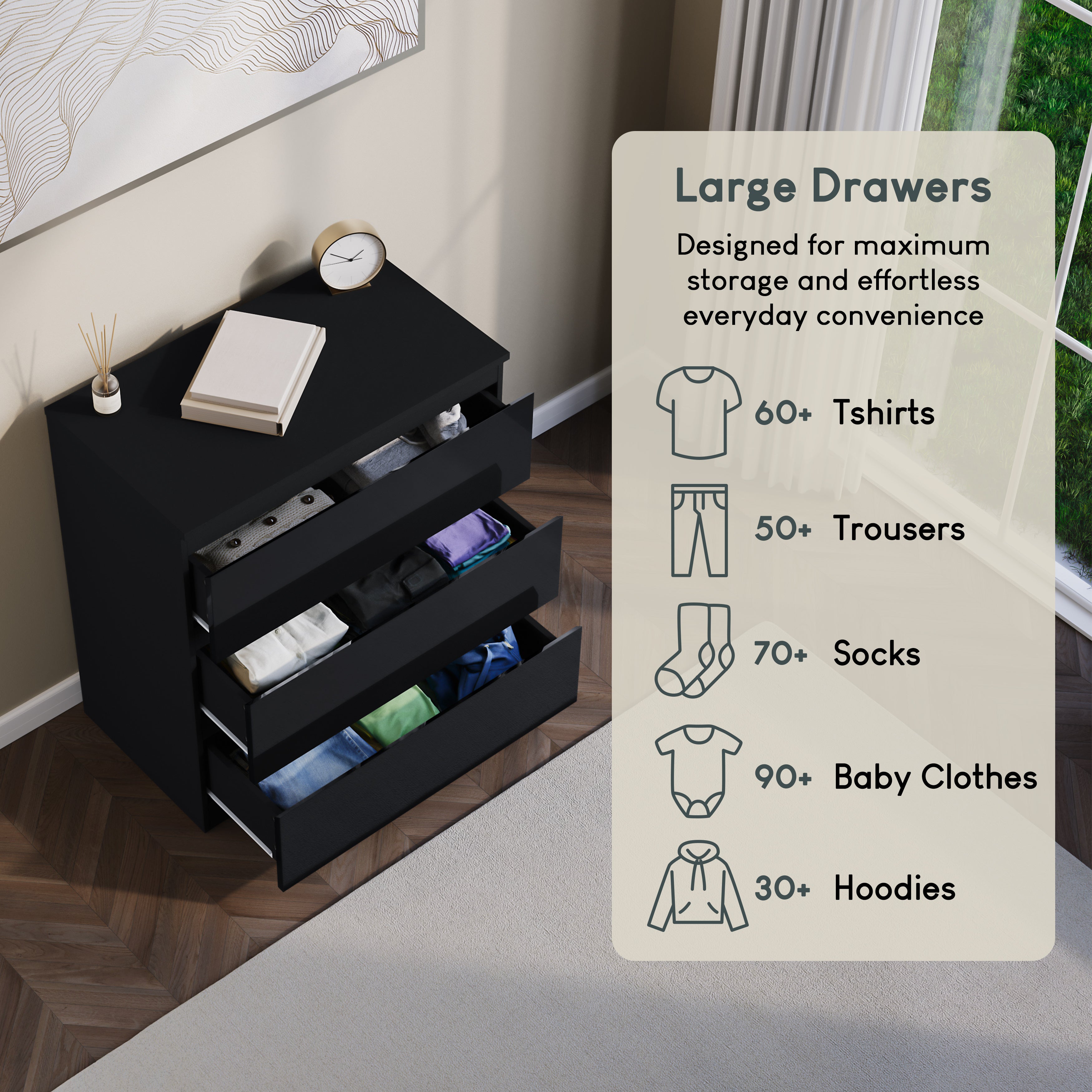 Smooth and Easy Access: The handle-free drawers glide smoothly, making it easy to access clothes or other belongings.