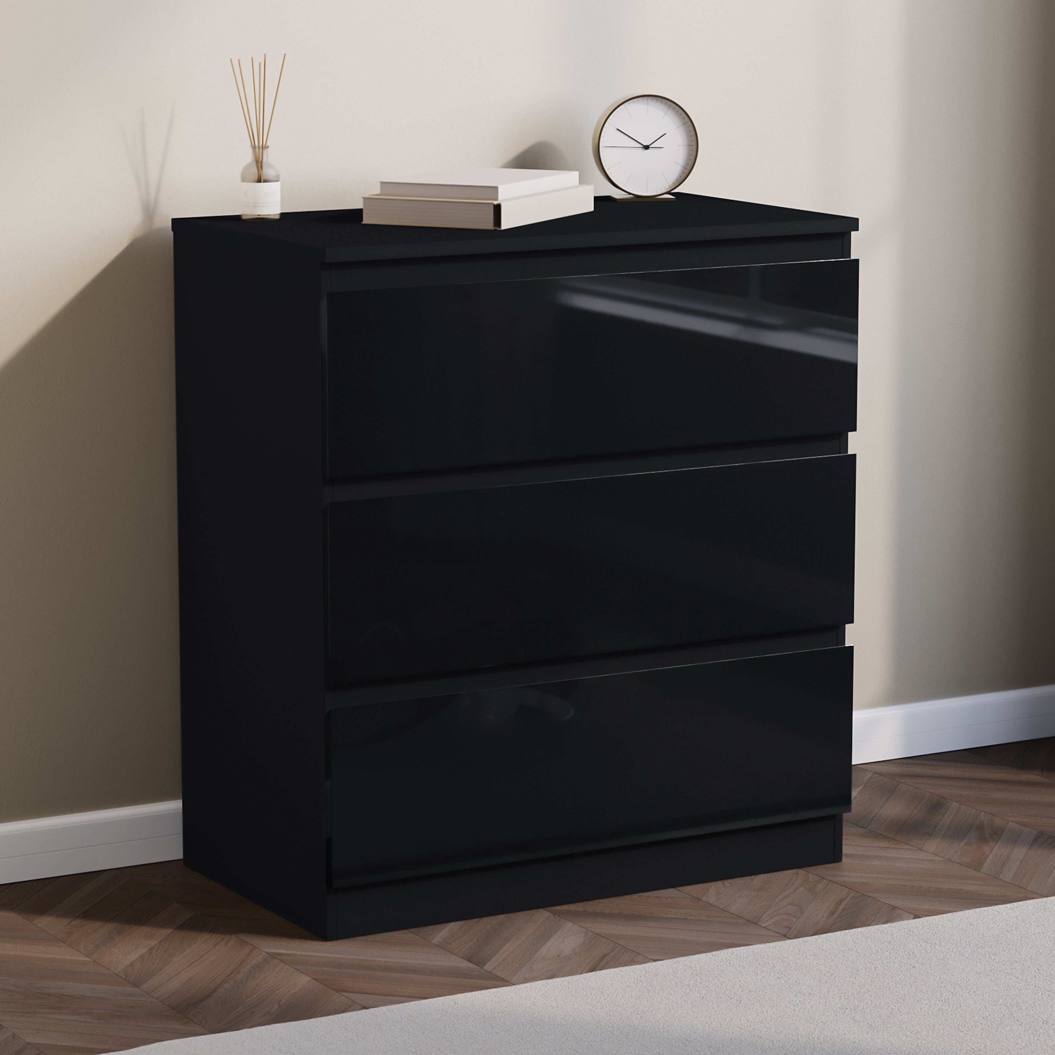 Contemporary Design: The Glinton chest of drawers features a sleek, handle-free design with high gloss drawers and a matte carcass, perfect for modern bedroom or living space decor.