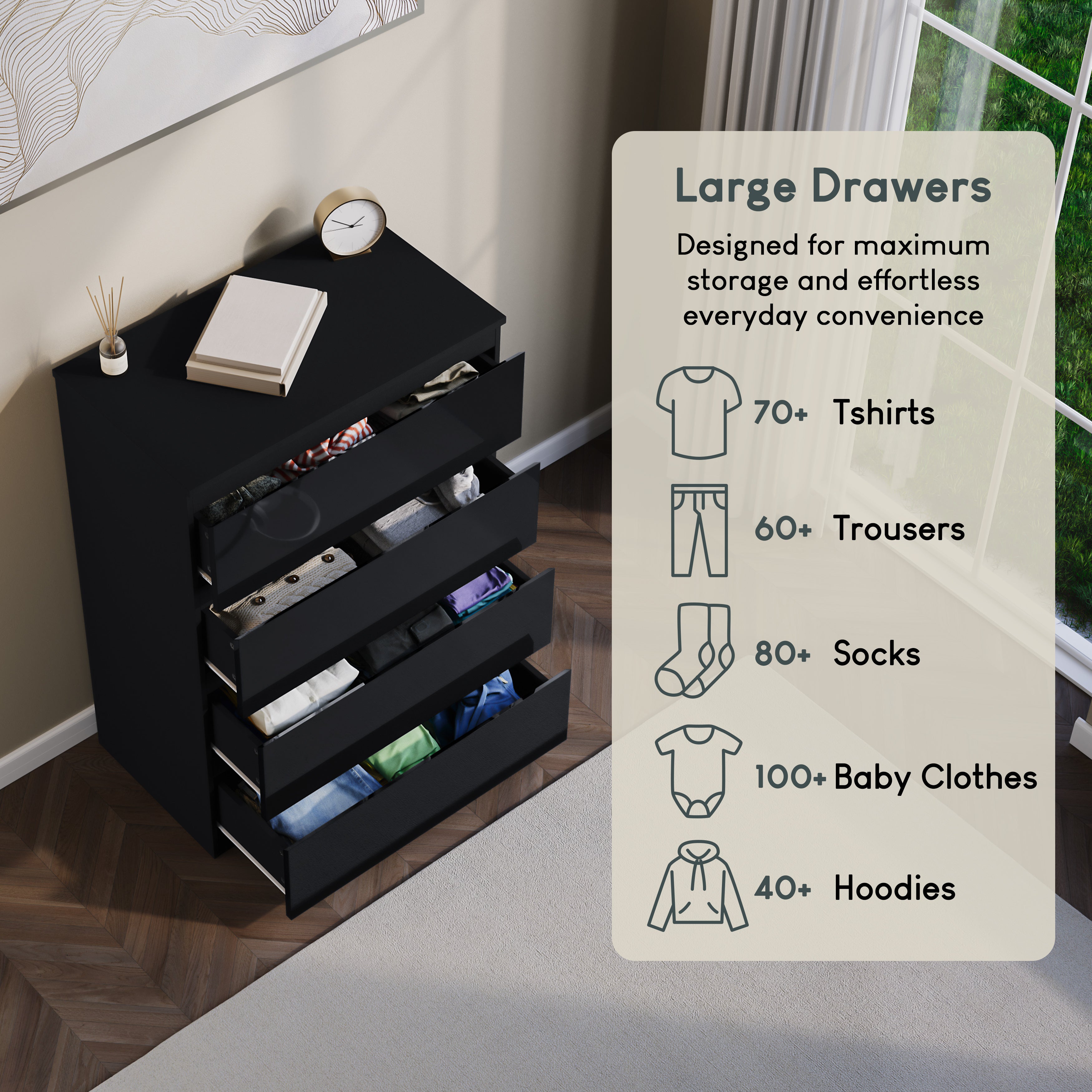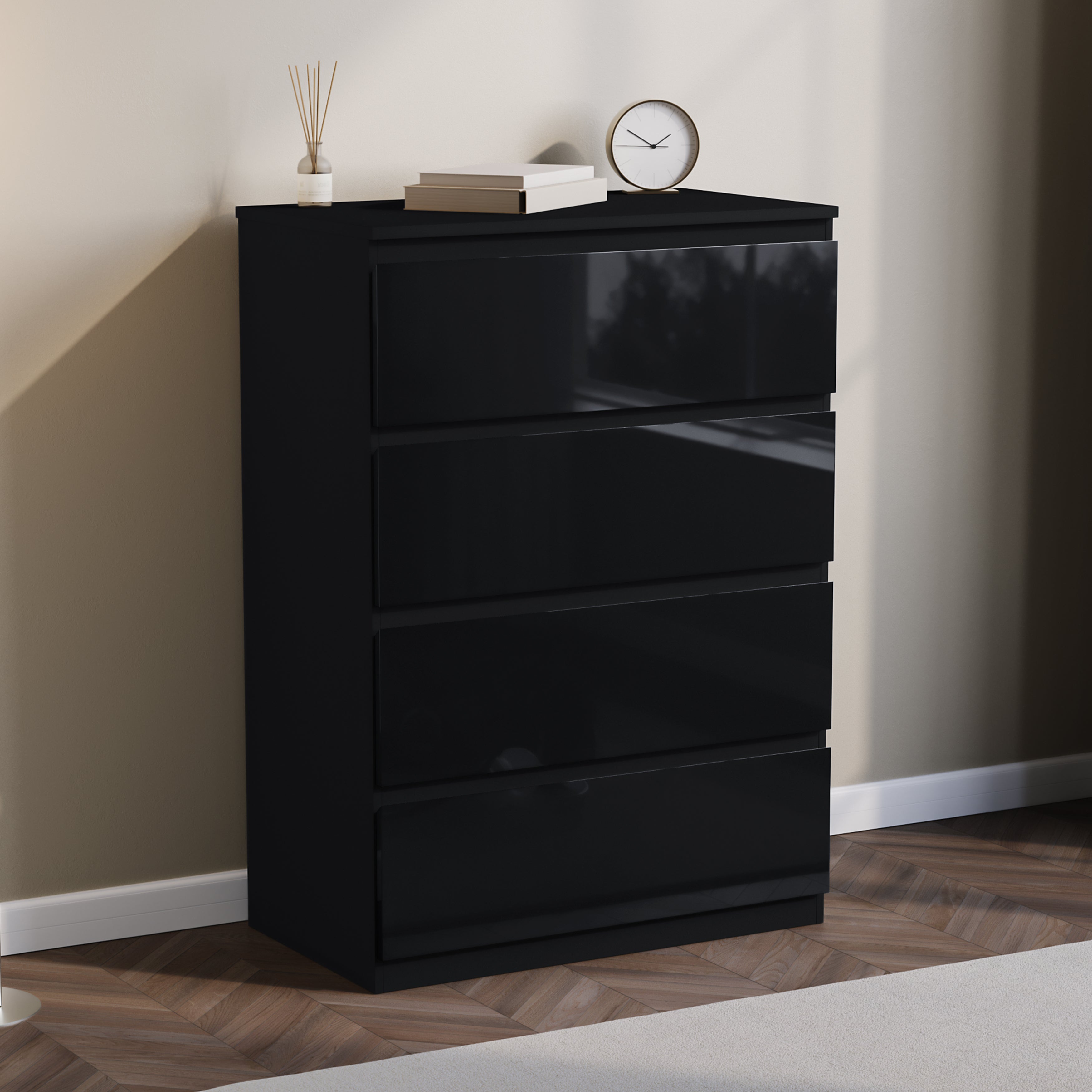 Stylish and Modern Design: The Glinton 4-Drawer Chest features a sleek finish with high gloss drawers and a matte carcass, ideal for contemporary bedroom or living spaces.