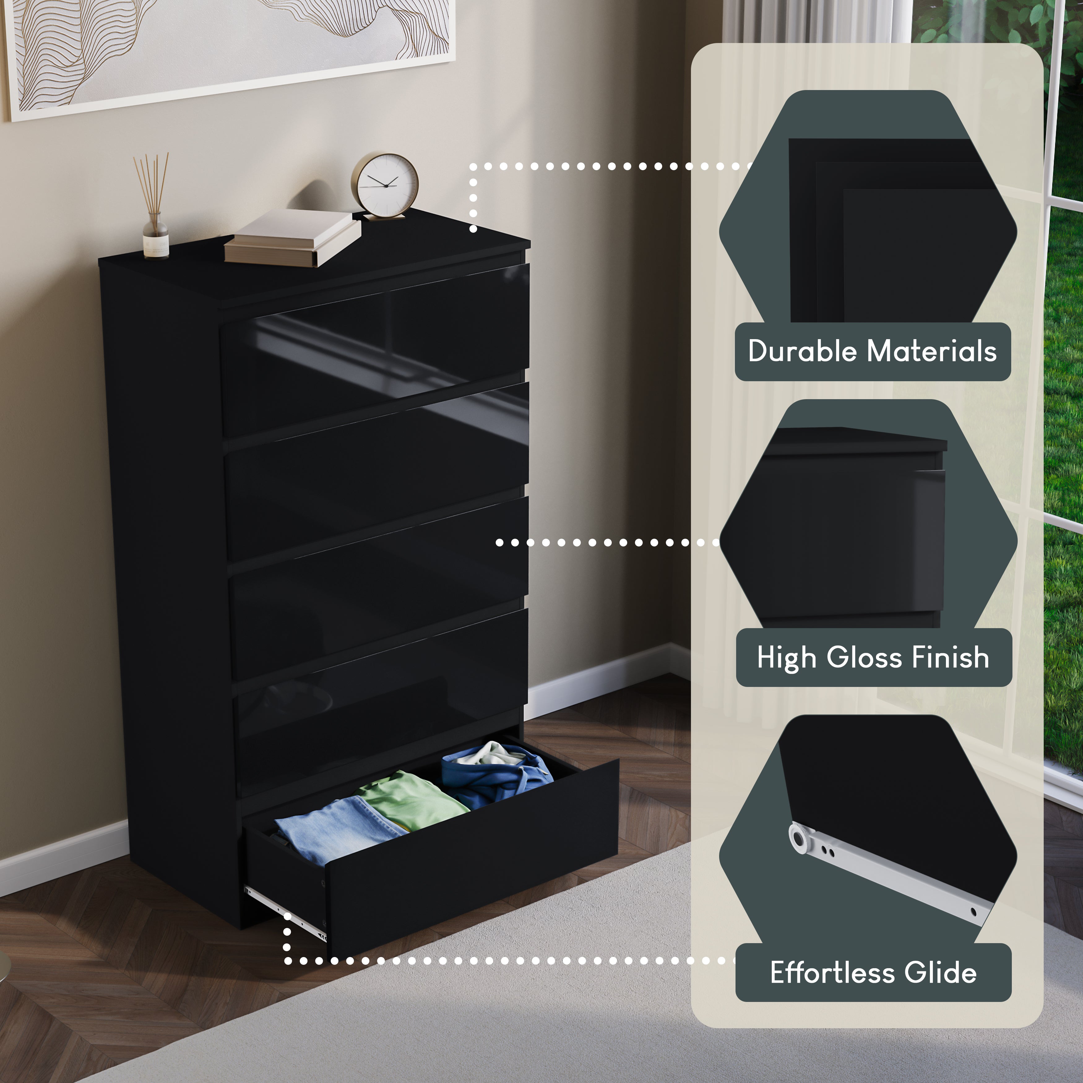 • Modern Aesthetic: The Glinton 5-Drawer Chest features high gloss drawers and a matte carcass, offering a sleek and contemporary look suitable for any bedroom or living space.