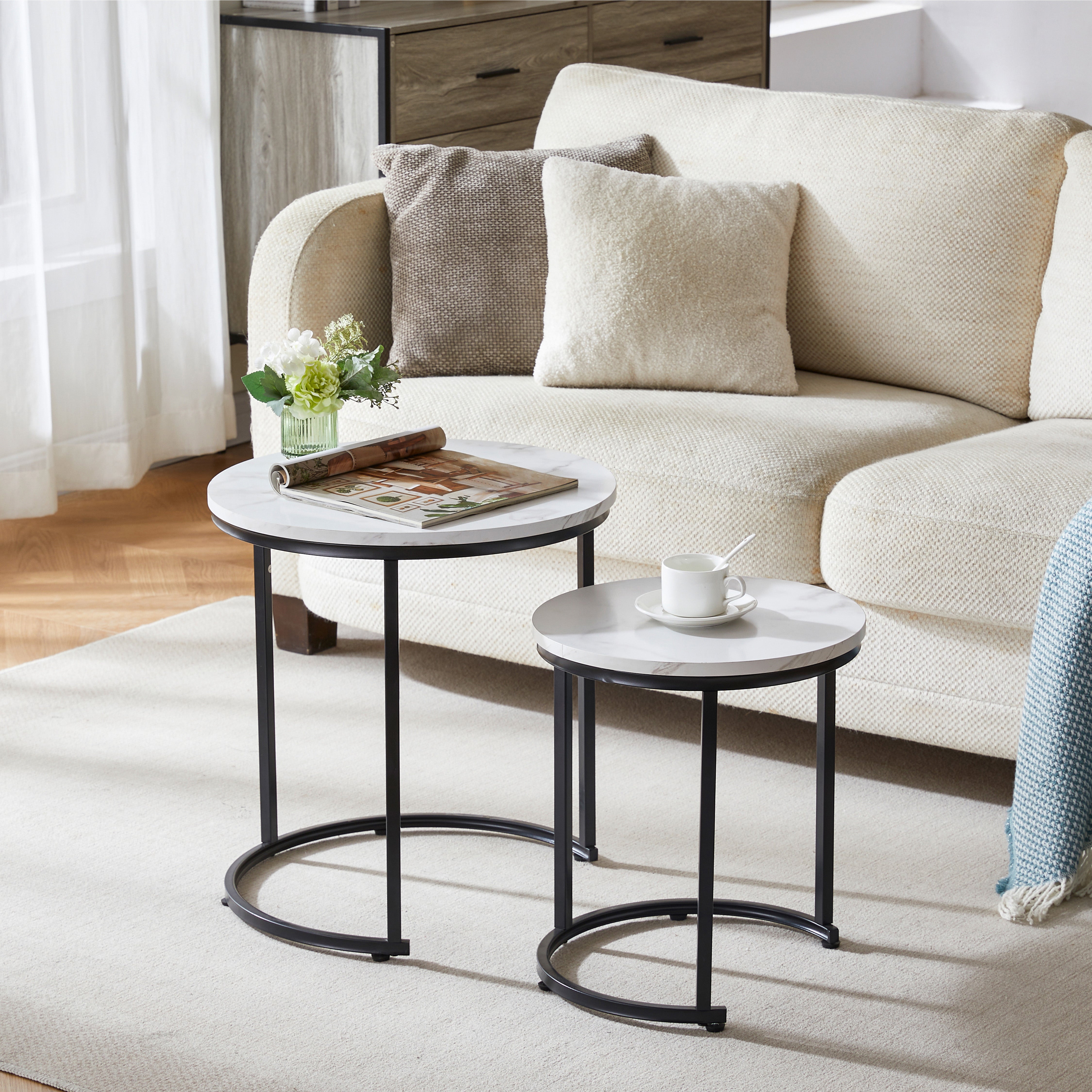 - Luxurious Marble Elegance: Transform your living space with a nest of tables featuring opulent marble tabletops, adding a touch of timeless luxury and sophistication to your home.