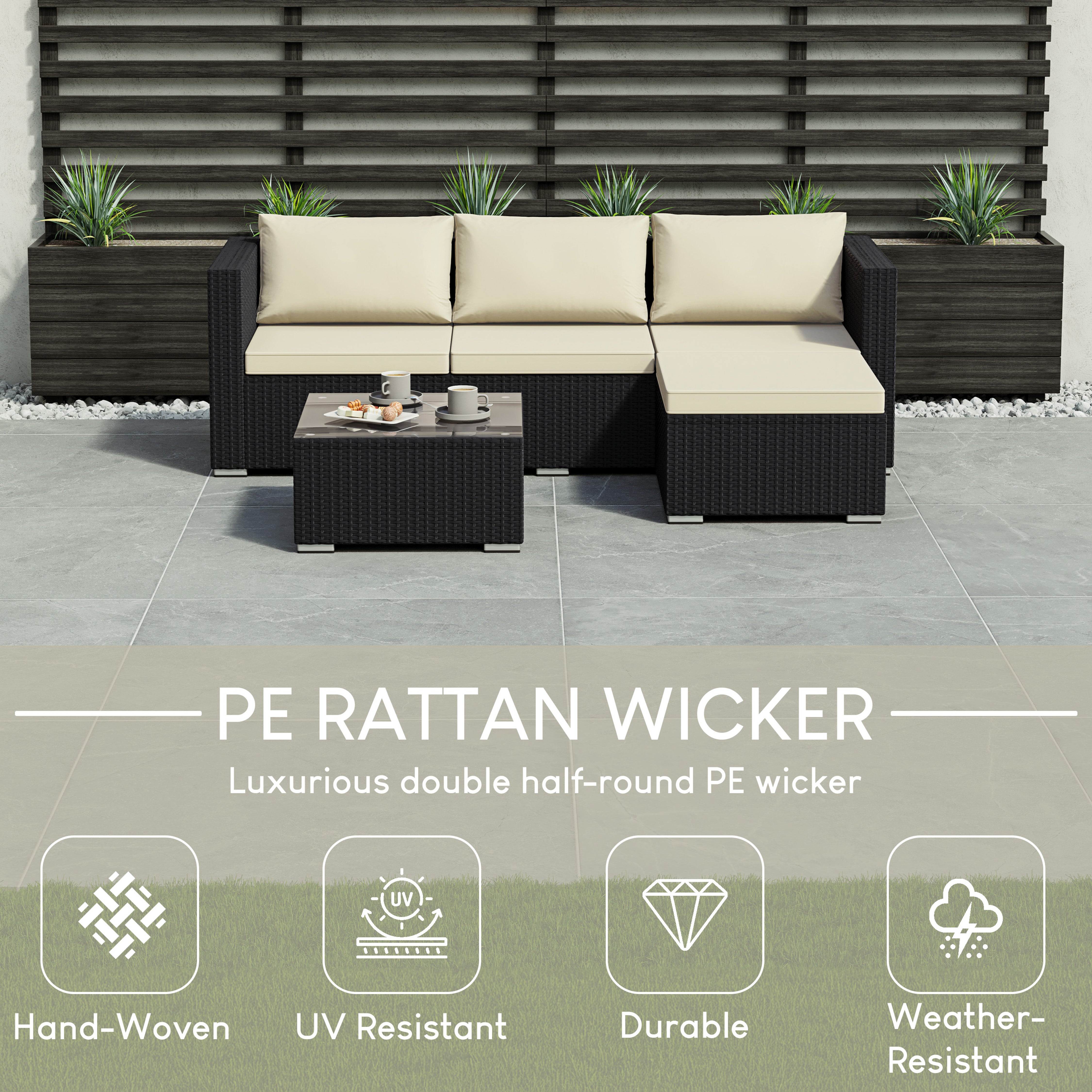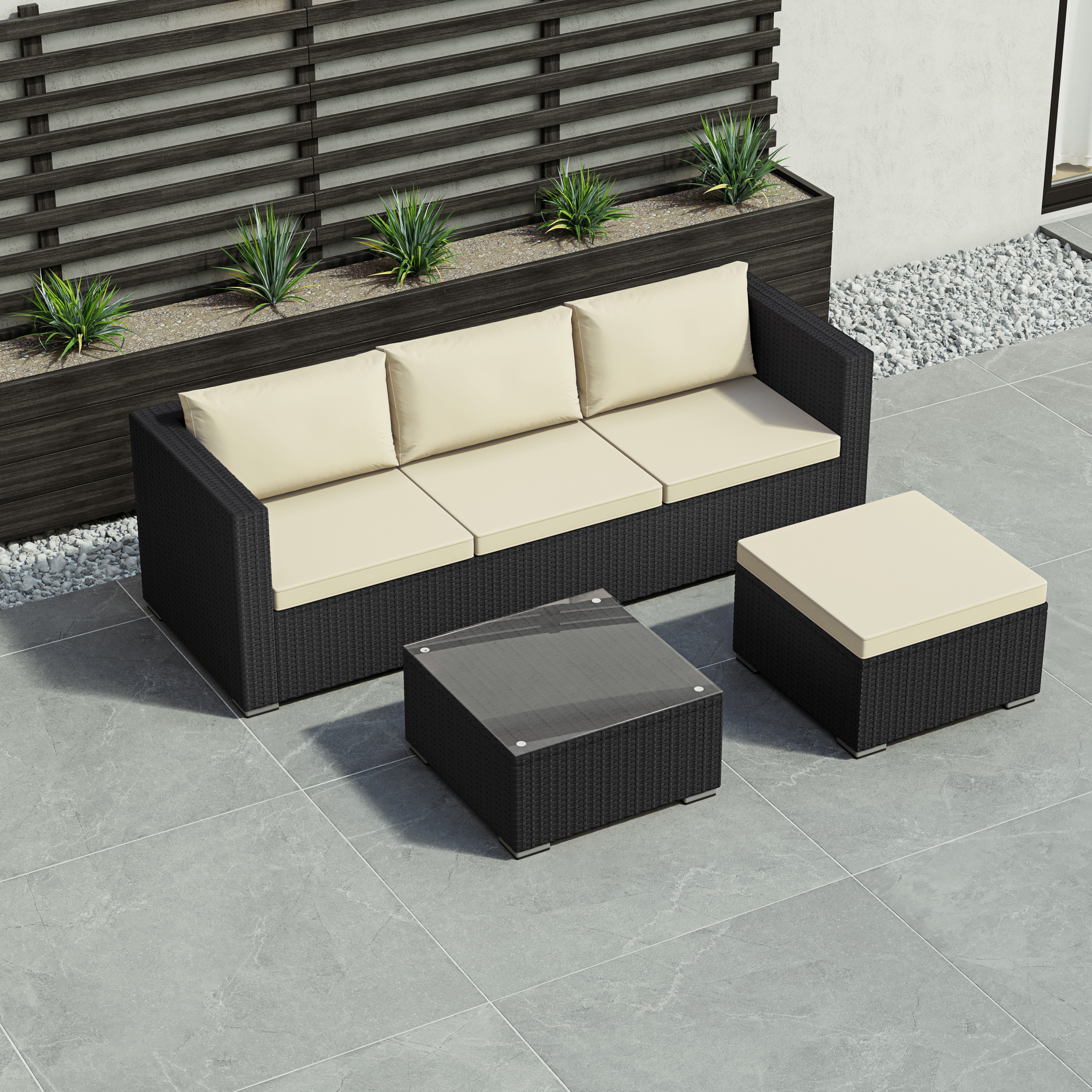 Versatile in layout, the modular design allows you to adapt the arrangement to suit your space. Whether you have a compact balcony or a larger garden patio, this set fits seamlessly into any outdoor setting.