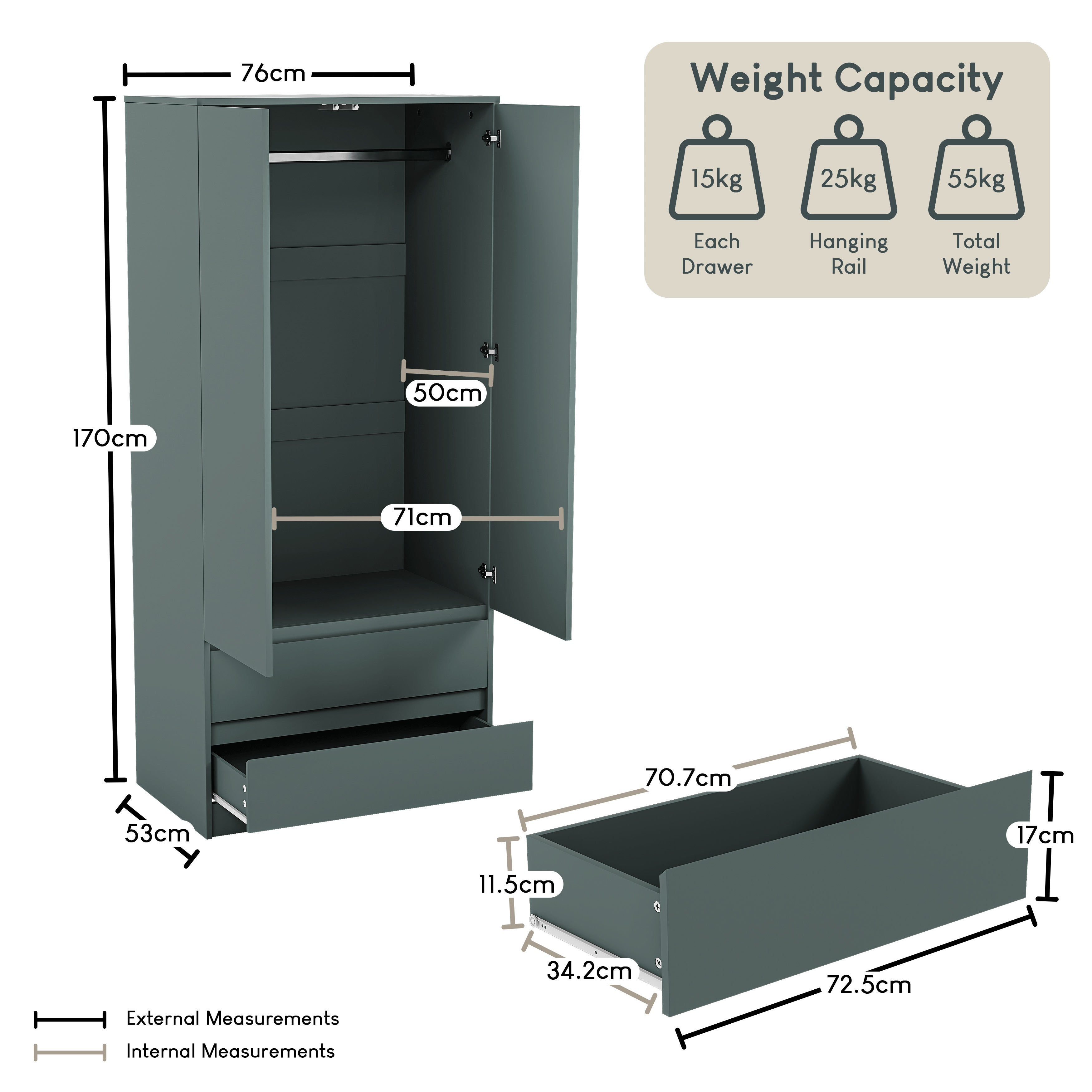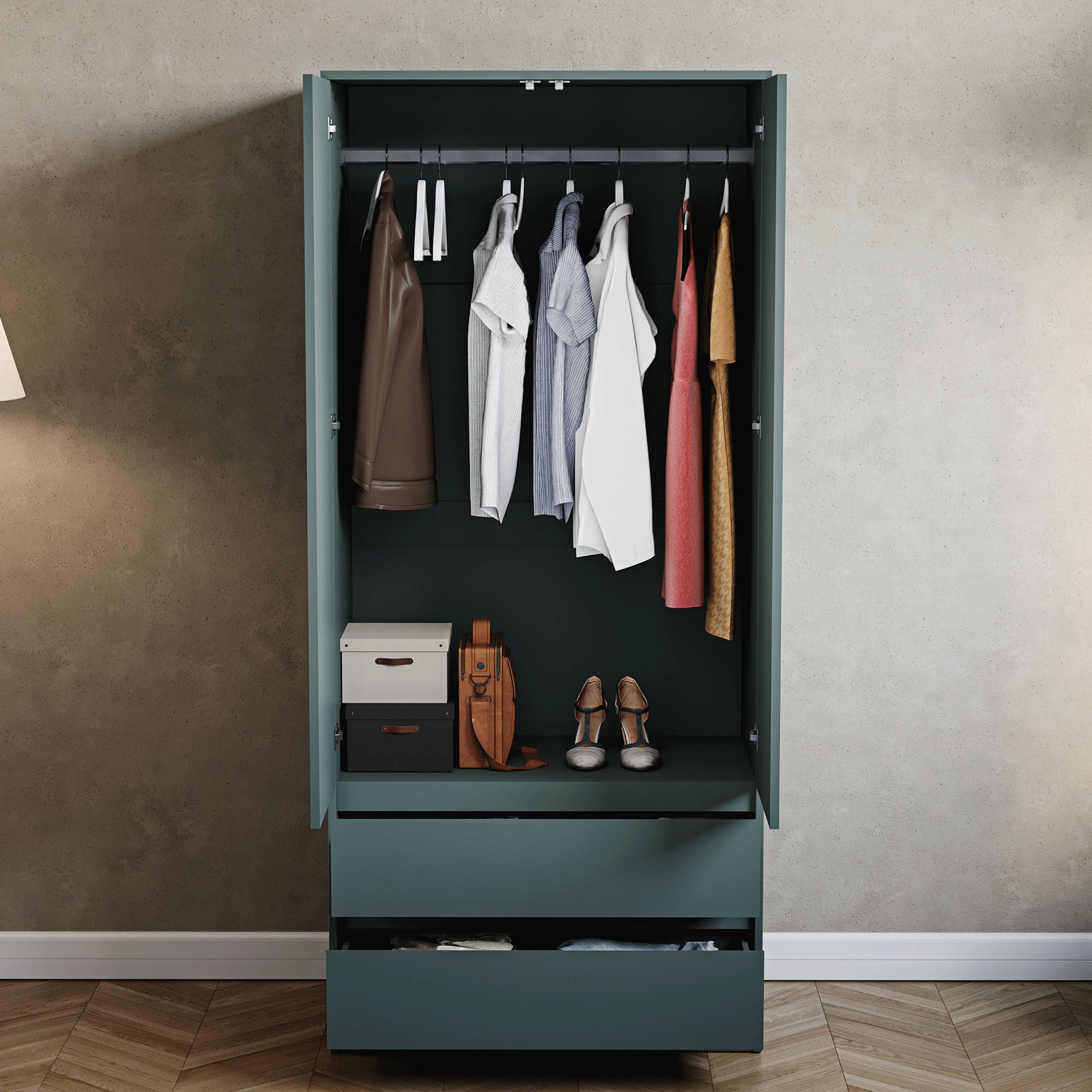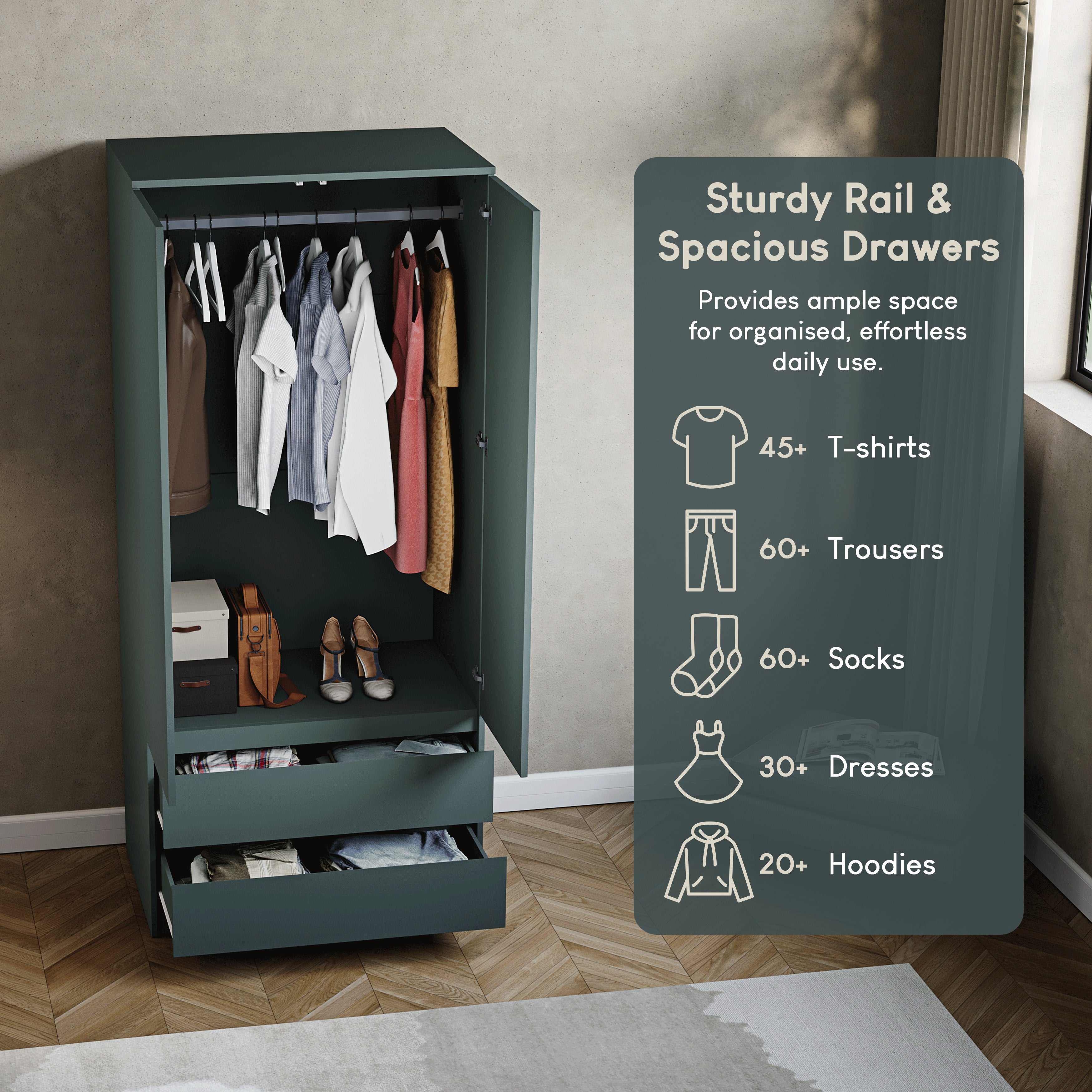 The wardrobe offers ample storage with its thoughtfully designed interior. Behind the two doors, you'll find a sturdy clothes rail, providing generous space to hang your garments, keeping them organised and wrinkle-free. Below, two spacious drawers offer additional storage for accessories, linens, or other bedroom essentials, helping you maintain a clutter-free environment.