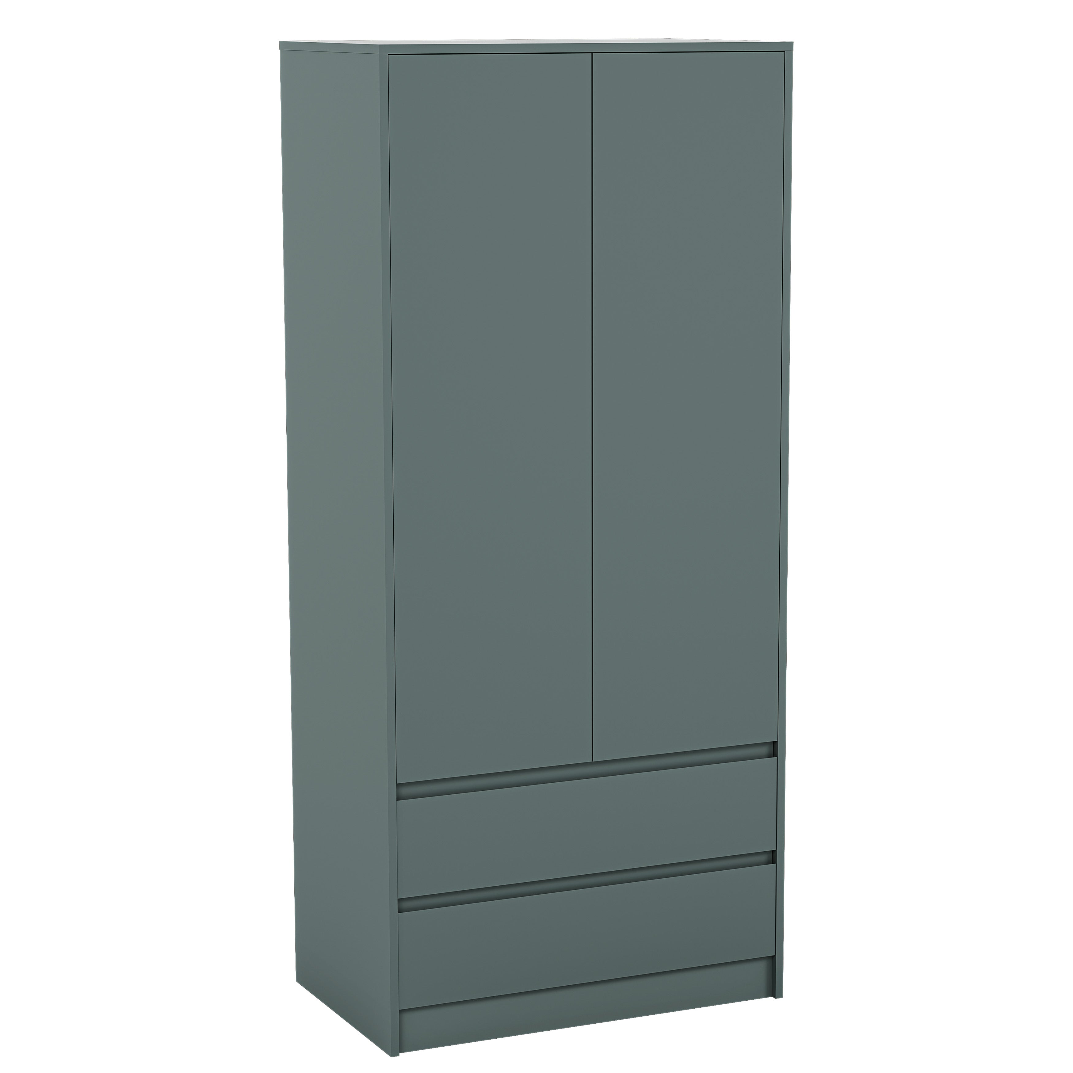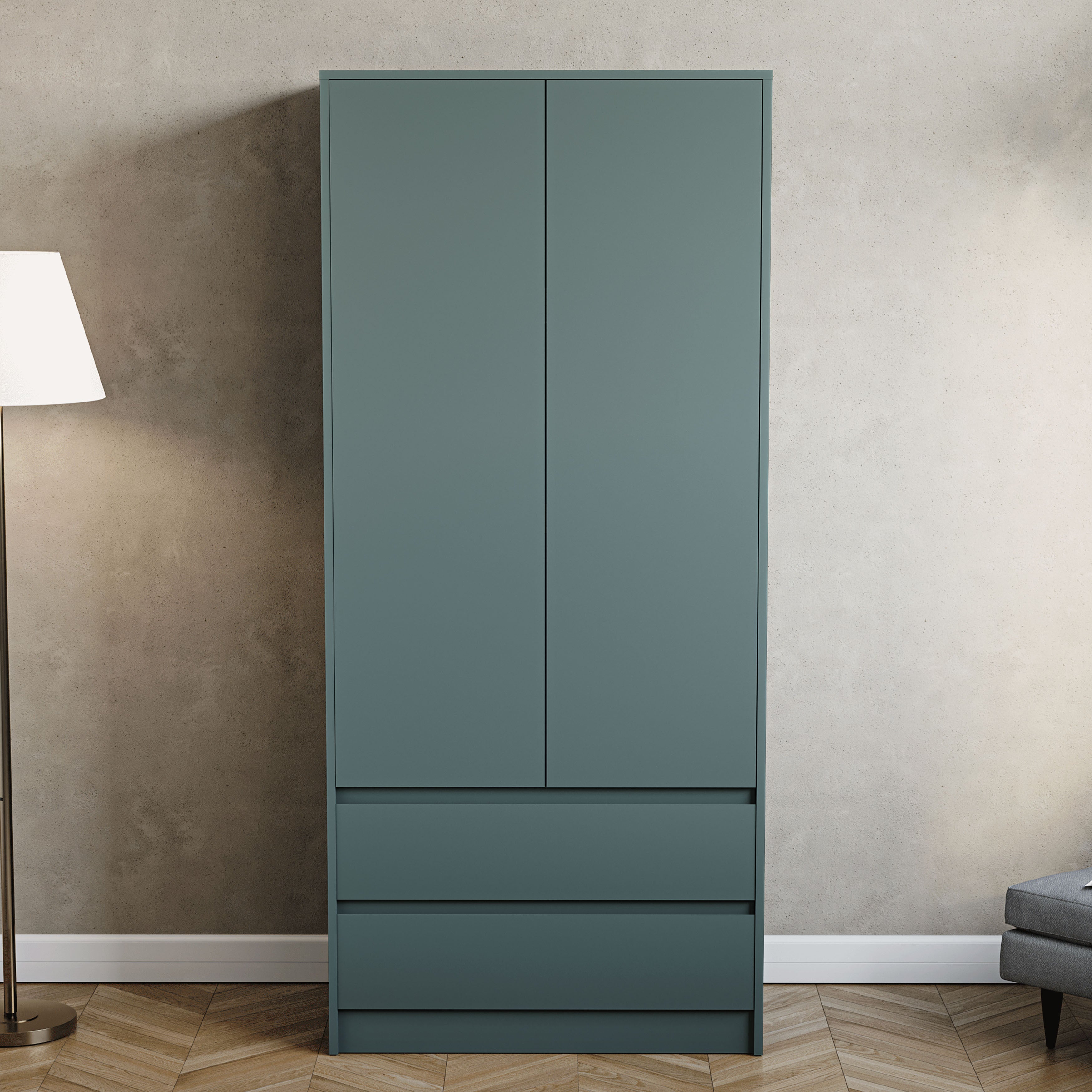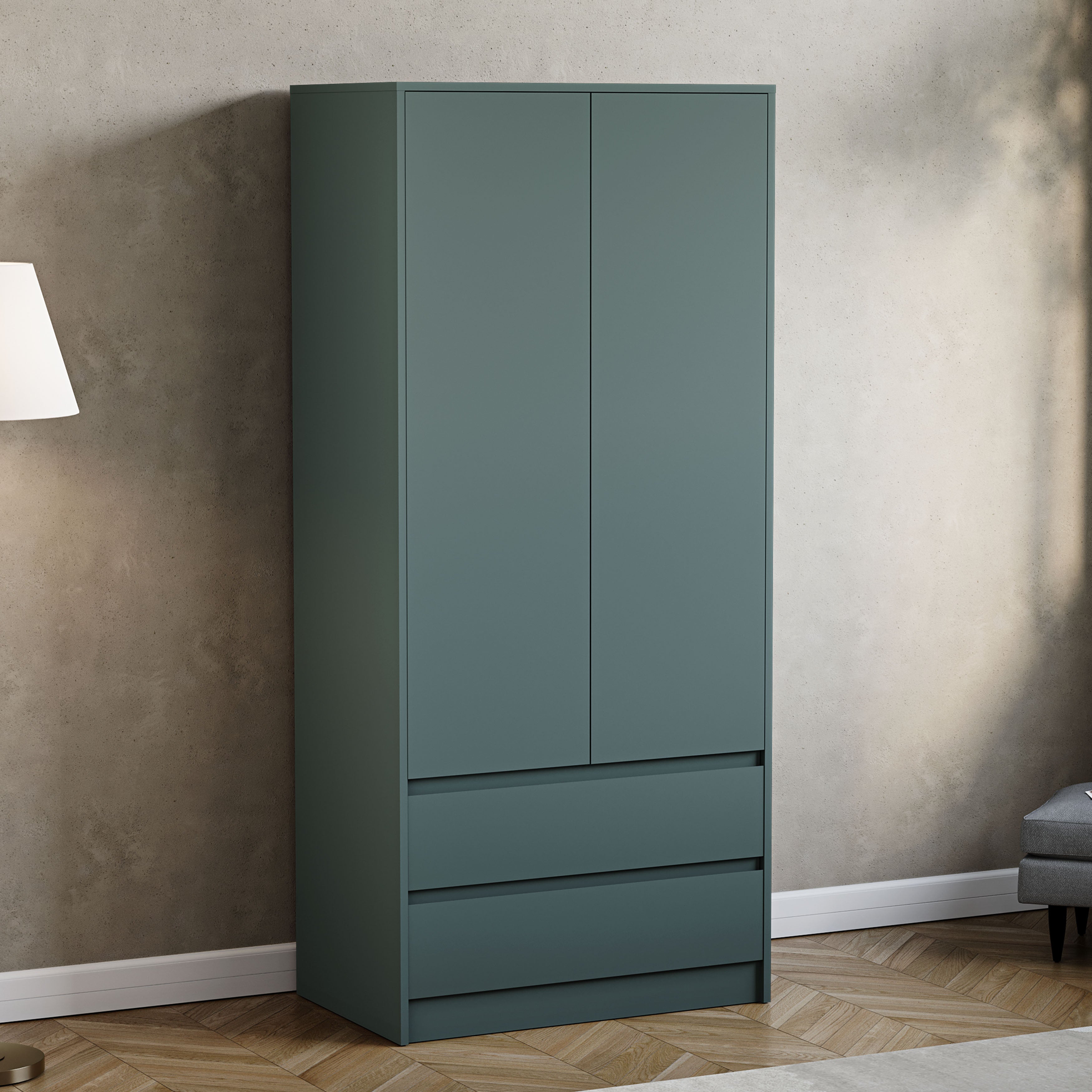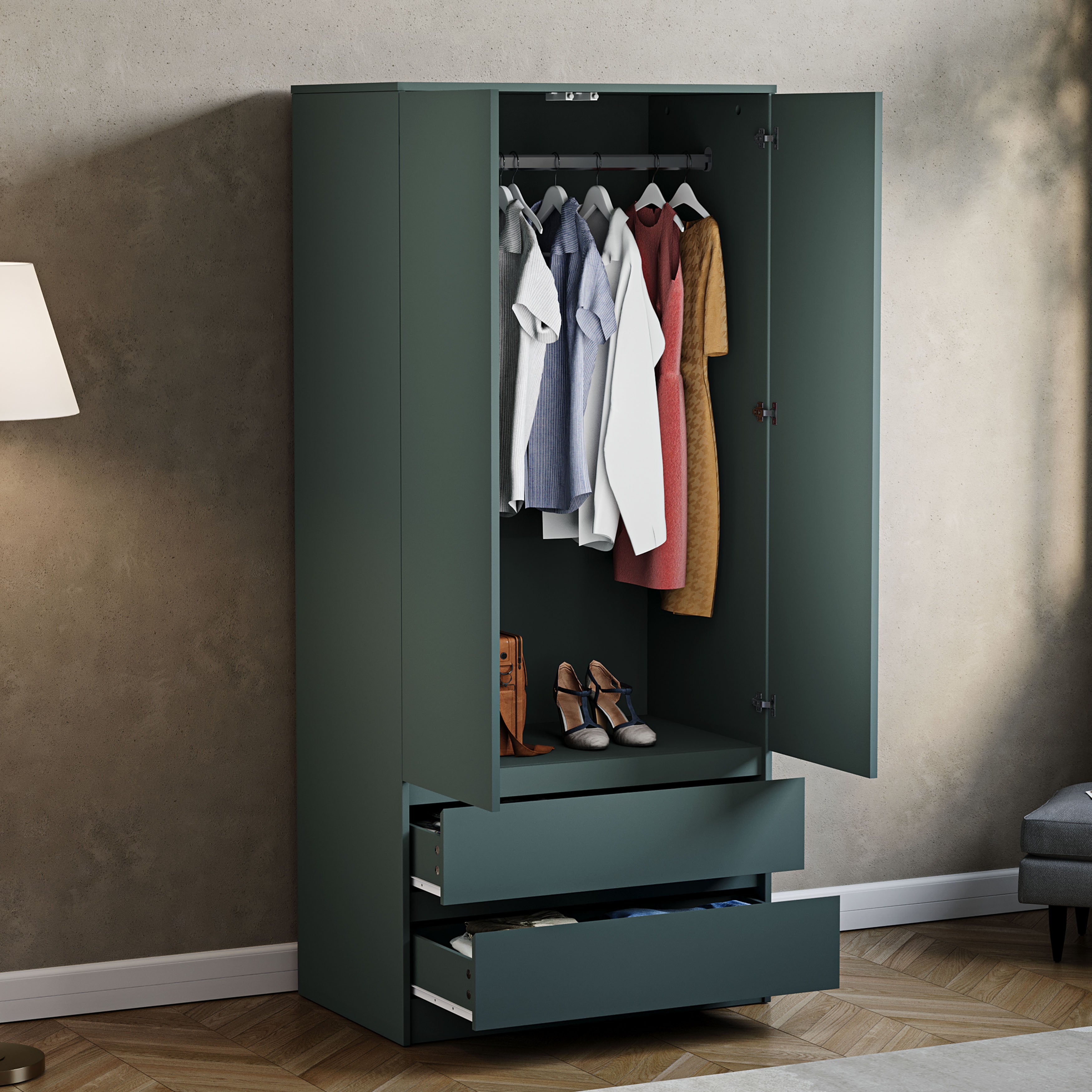 The wardrobe offers ample storage with its thoughtfully designed interior. Behind the two doors, you'll find a sturdy clothes rail, providing generous space to hang your garments, keeping them organised and wrinkle-free. Below, two spacious drawers offer additional storage for accessories, linens, or other bedroom essentials, helping you maintain a clutter-free environment.