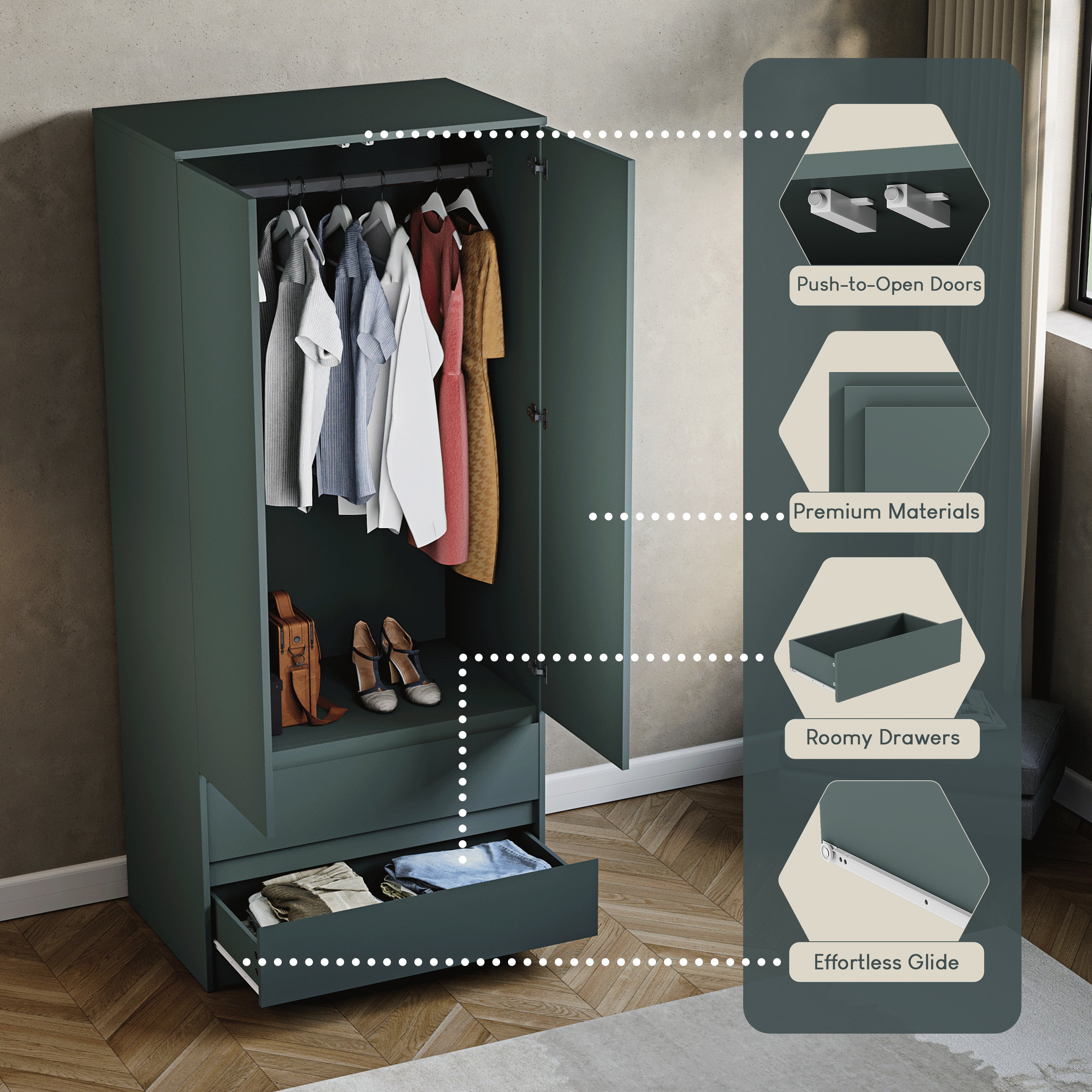 • Spacious Storage: Features two doors and two drawers, offering generous storage for clothing, accessories, and other bedroom essentials.