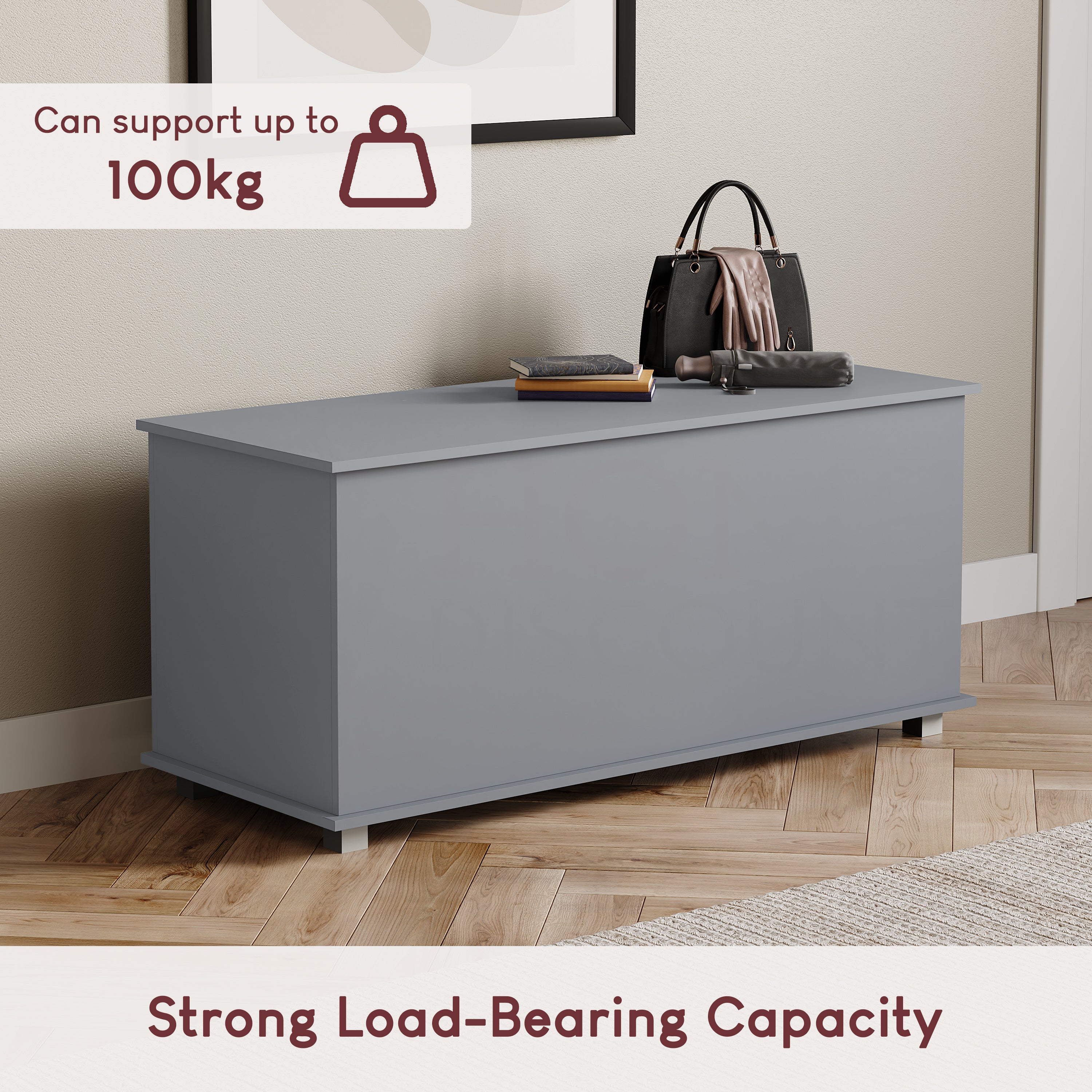 HOME DISCOUNT offers this stunning new product with a modern, stylish design, the Leon Storage Ottoman - Grey. This storage ottoman is the perfect solution for any bedroom, living room or hallway. Made from wood, the storage ottoman bench is modern and chic. The ottoman design feature of the bench allows you to store anything that you need; bedding, pillows or even children's play toys. With the benches' durable chipboard frame a sturdy construction, it can be used for resting your feet upon or sitting.