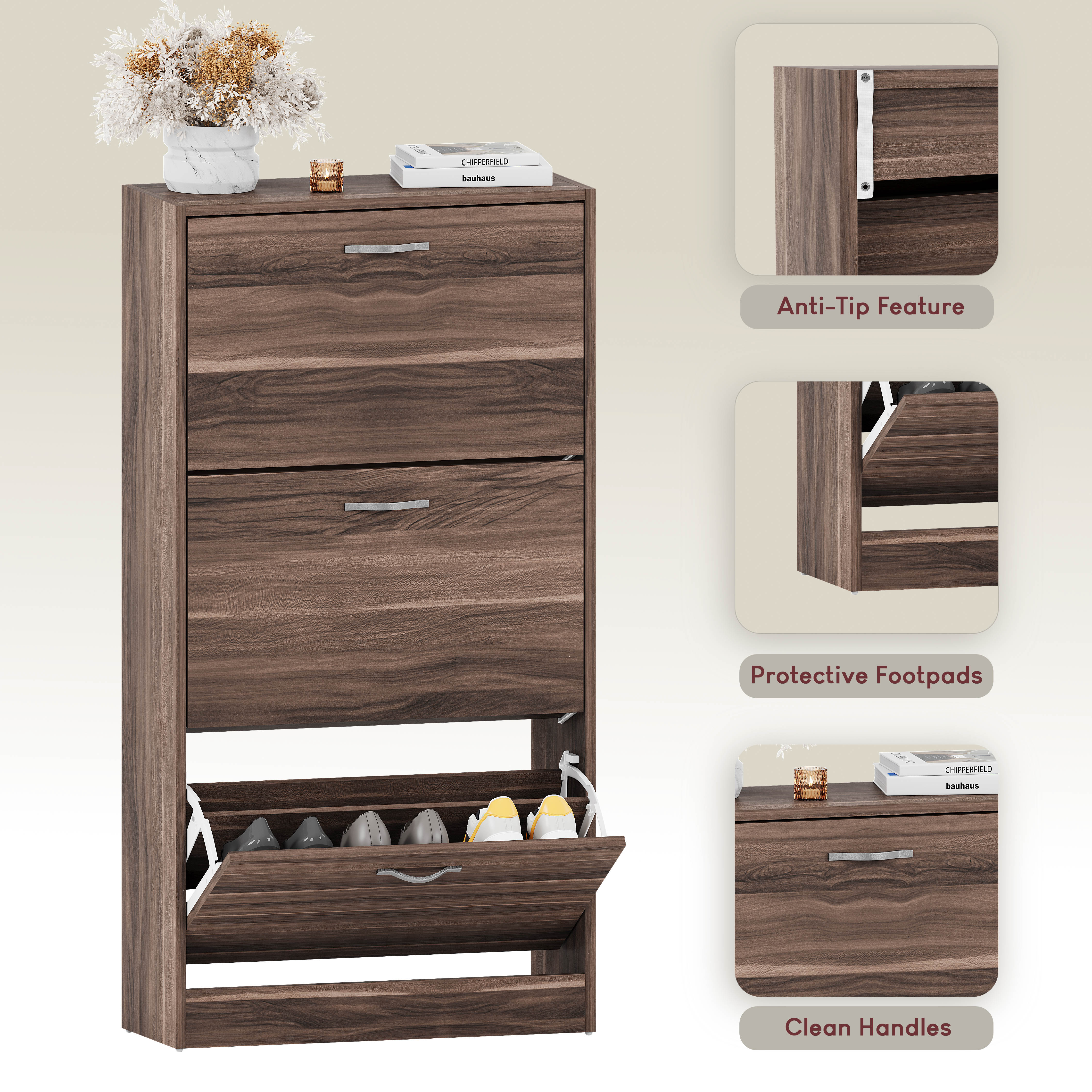 - Efficient Storage: This 3-drawer shoe cabinet can hold up to 3-4 pairs of shoes in each drawer, keeping your collection organized and easily accessible.