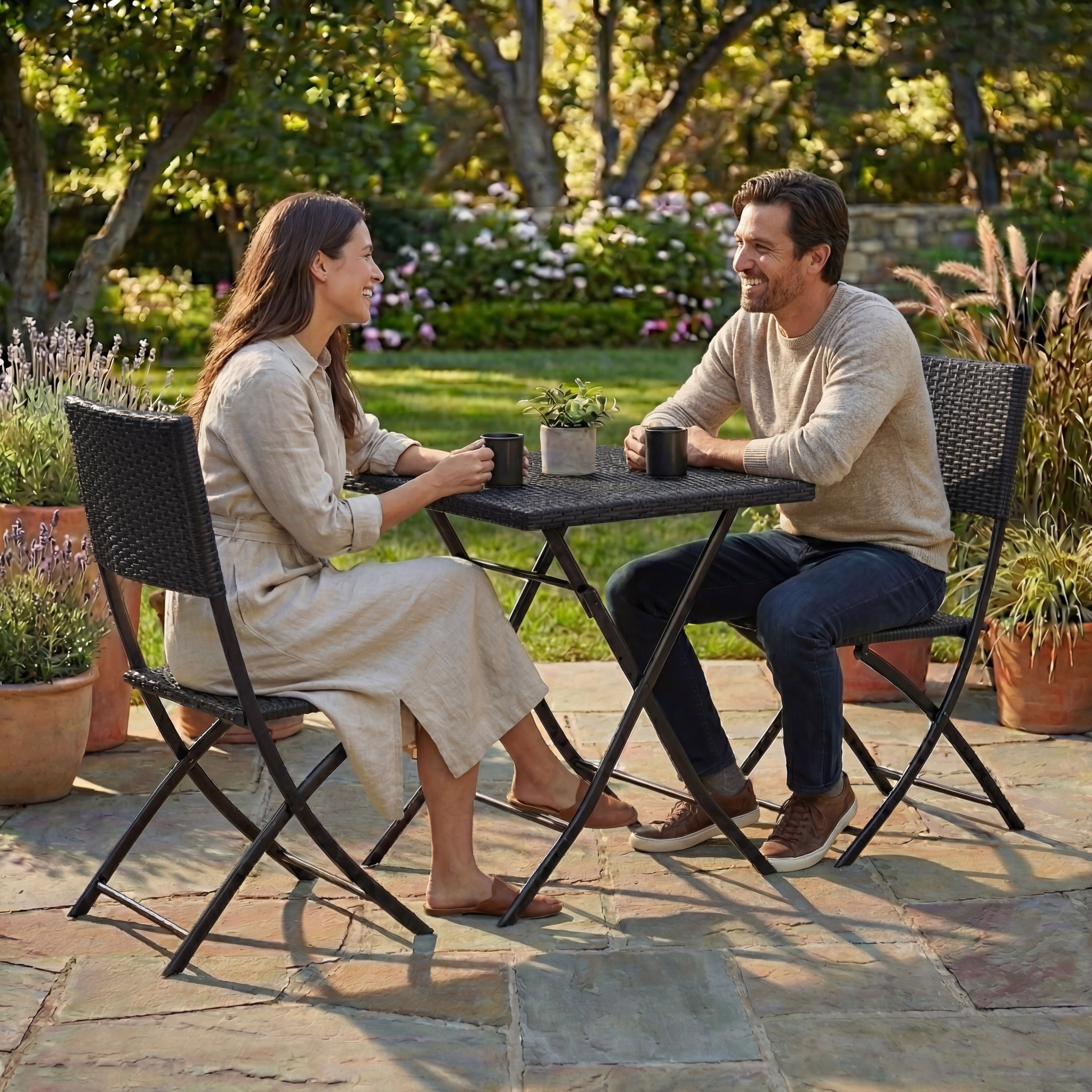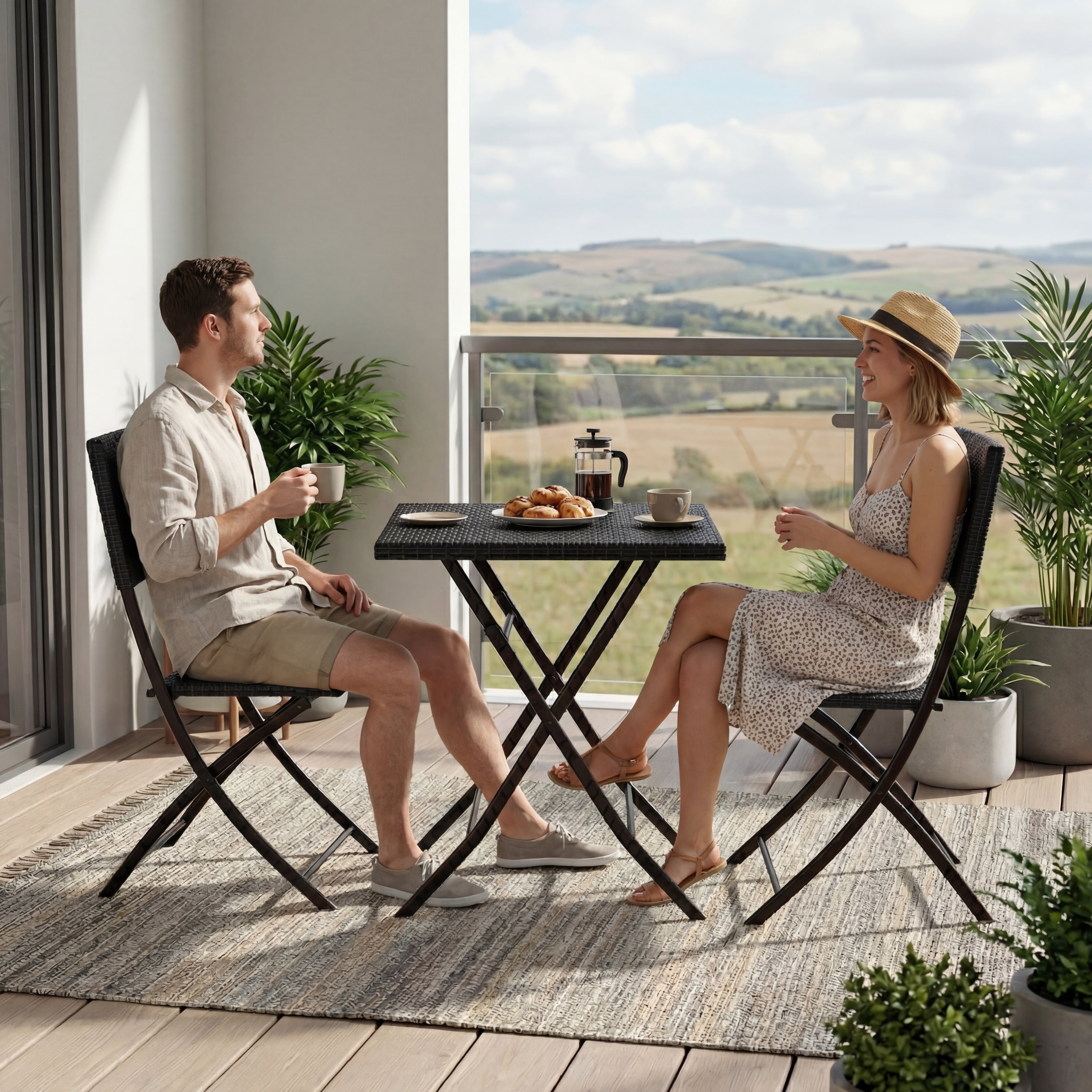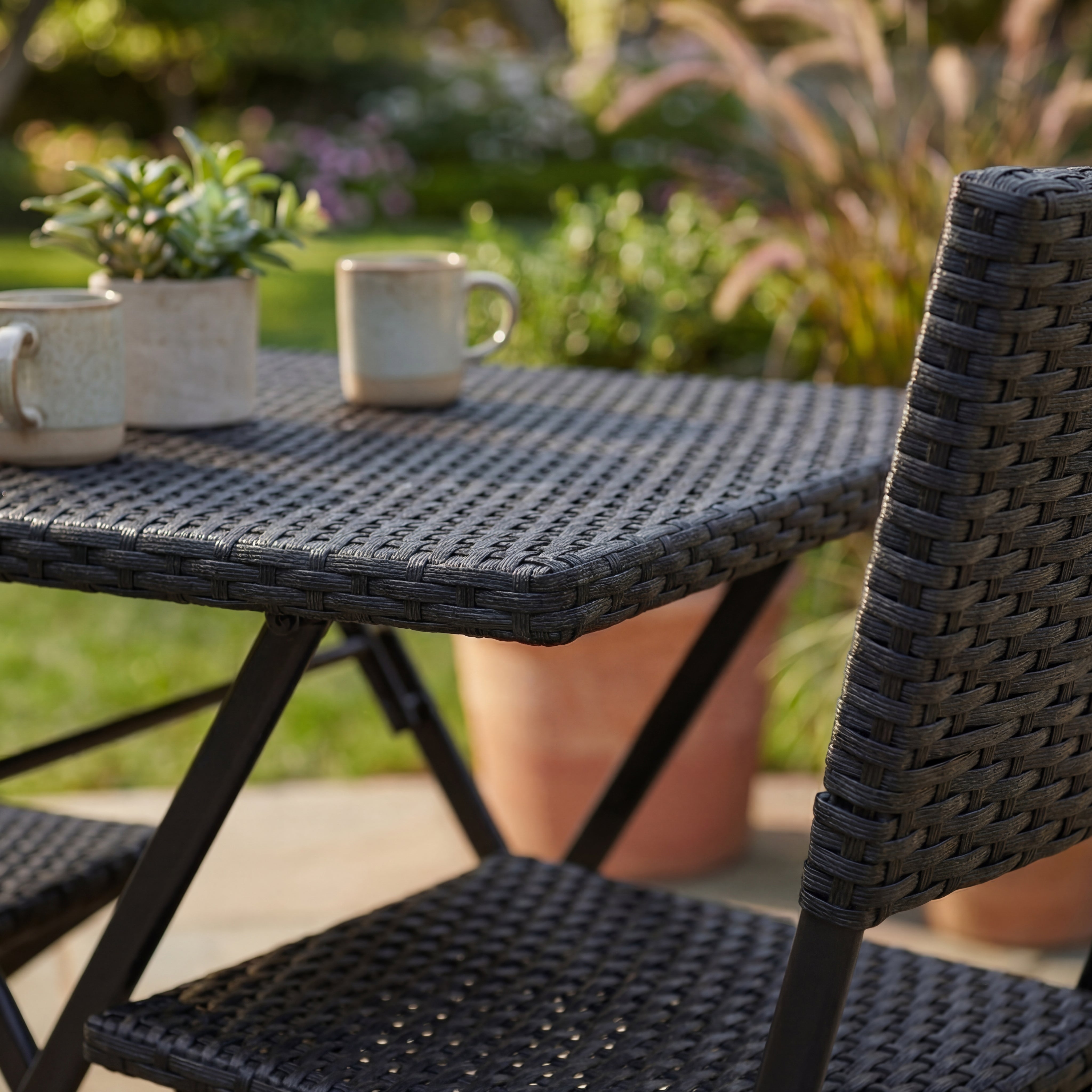 No assembly is required, so you can start using your new bistro set right out of the box. Simply unfold the chairs and table, and you’re ready to relax and enjoy. The high-quality rattan construction ensures durability and weather resistance, providing long-lasting use and maintaining its stylish appearance.