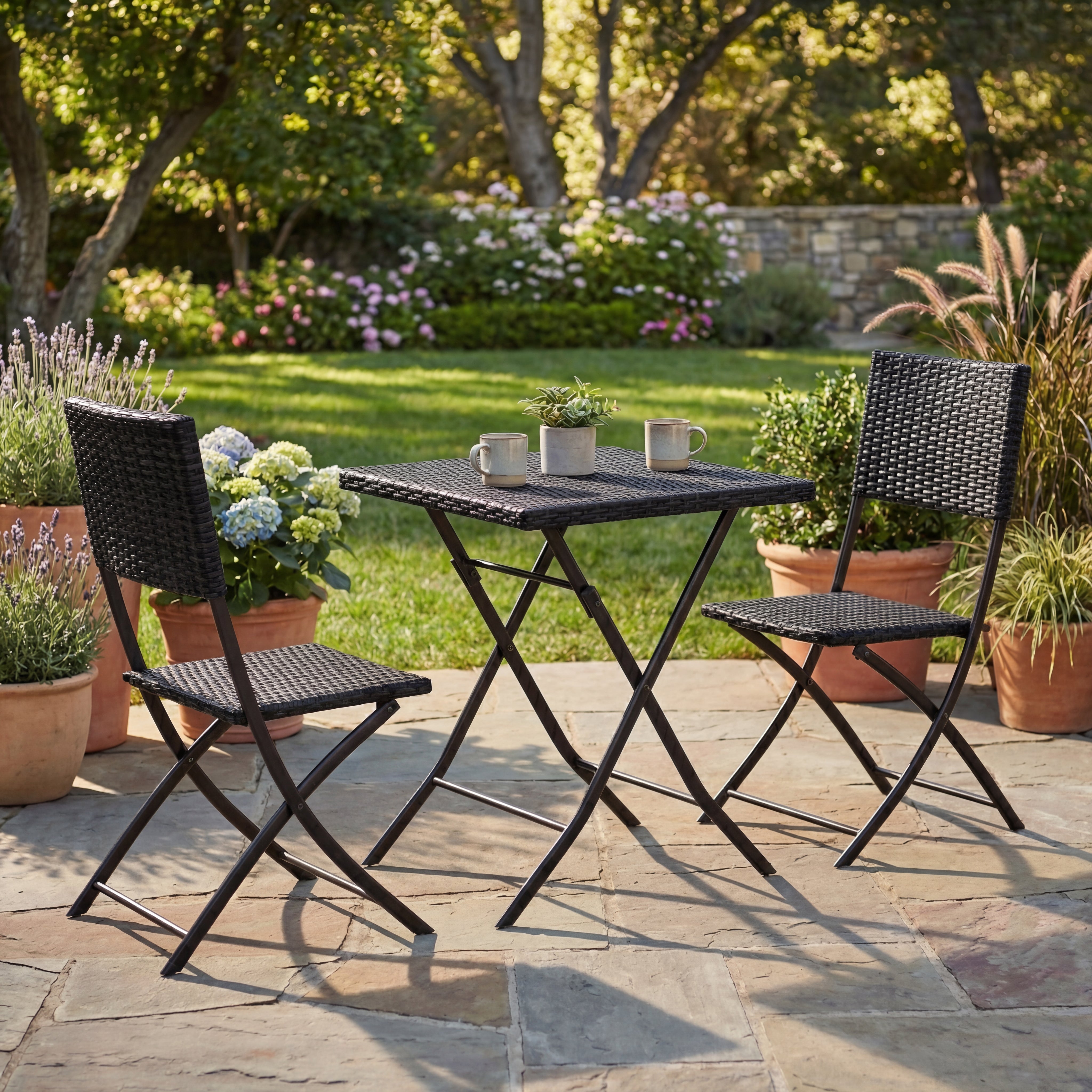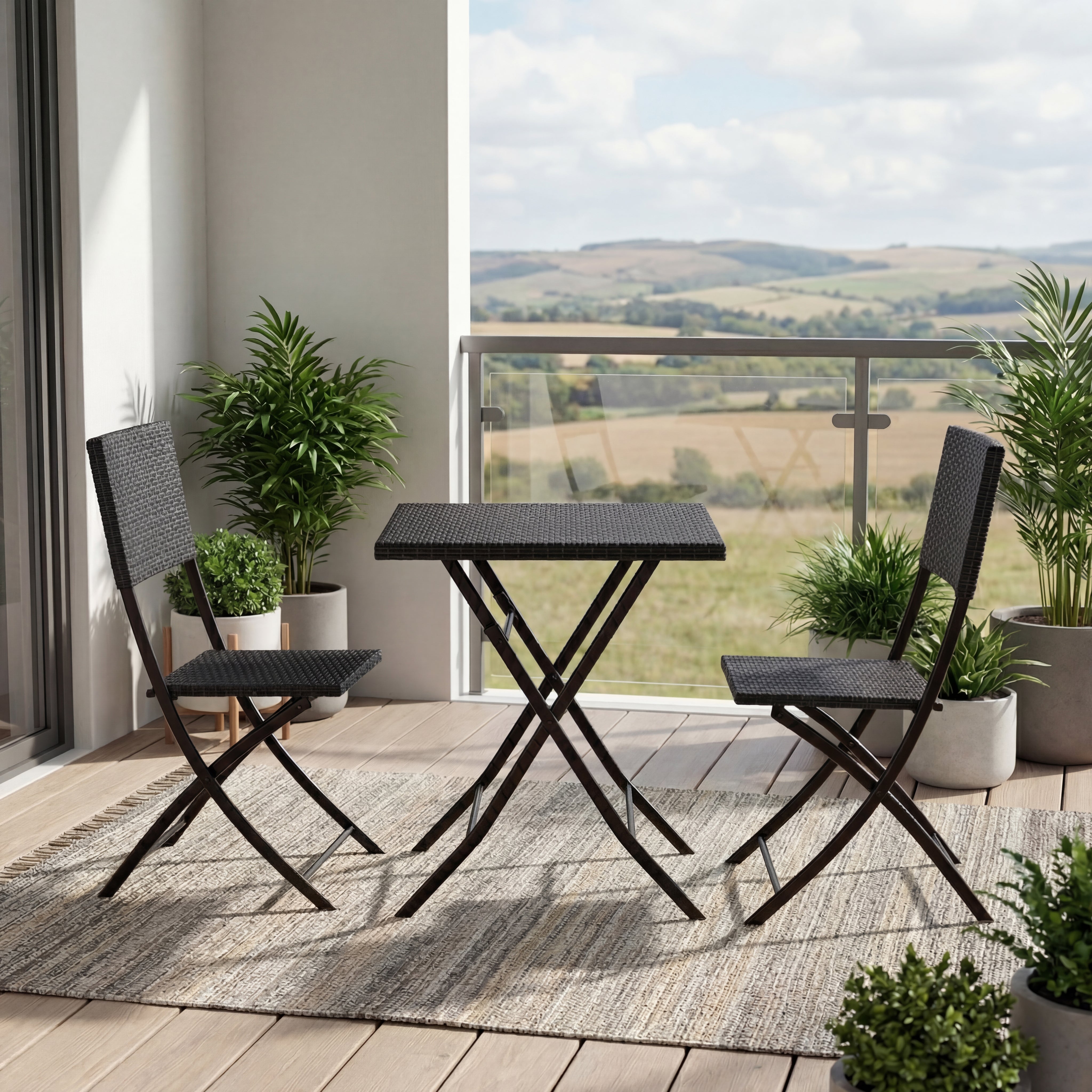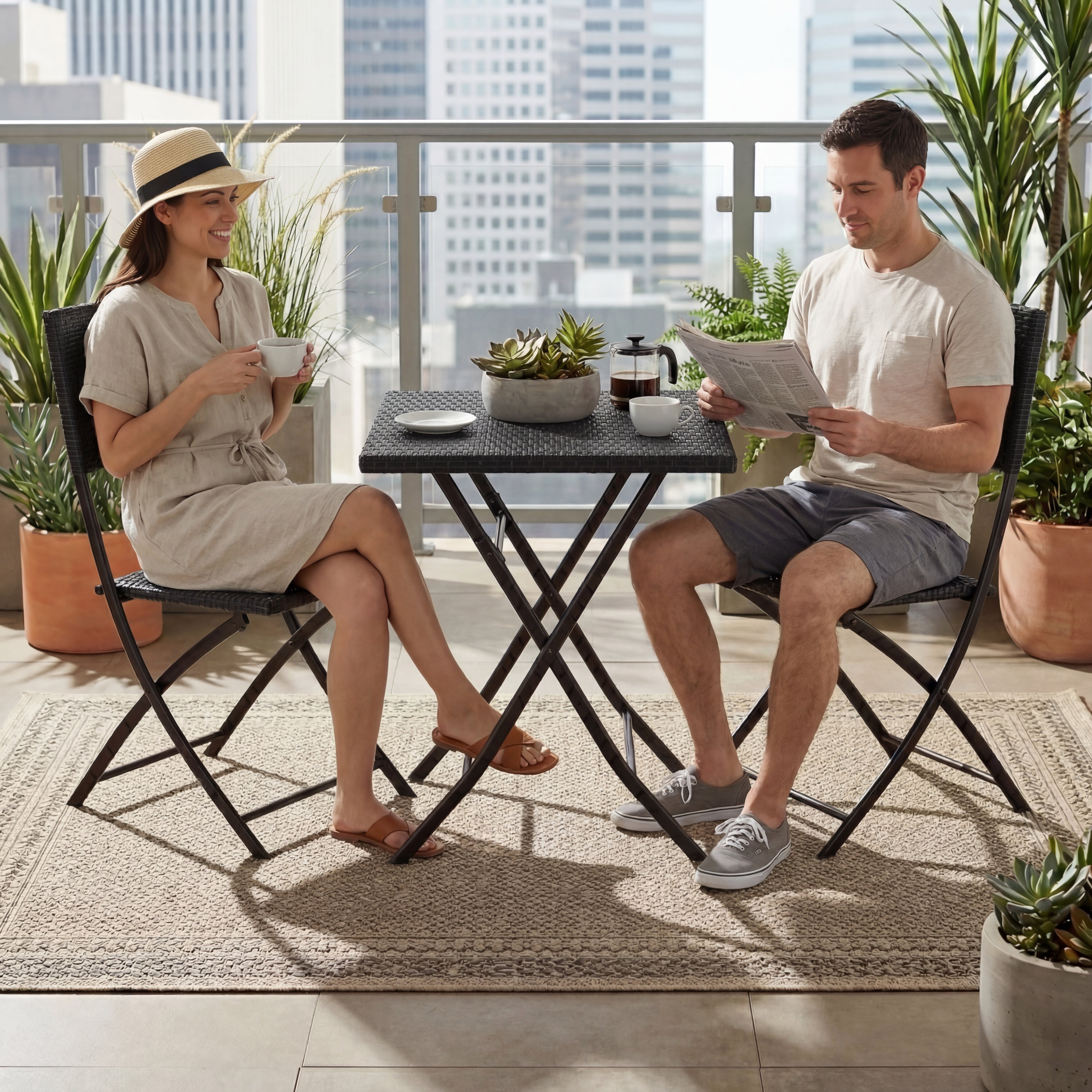 No assembly is required, so you can start using your new bistro set right out of the box. Simply unfold the chairs and table, and you’re ready to relax and enjoy. The high-quality rattan construction ensures durability and weather resistance, providing long-lasting use and maintaining its stylish appearance.