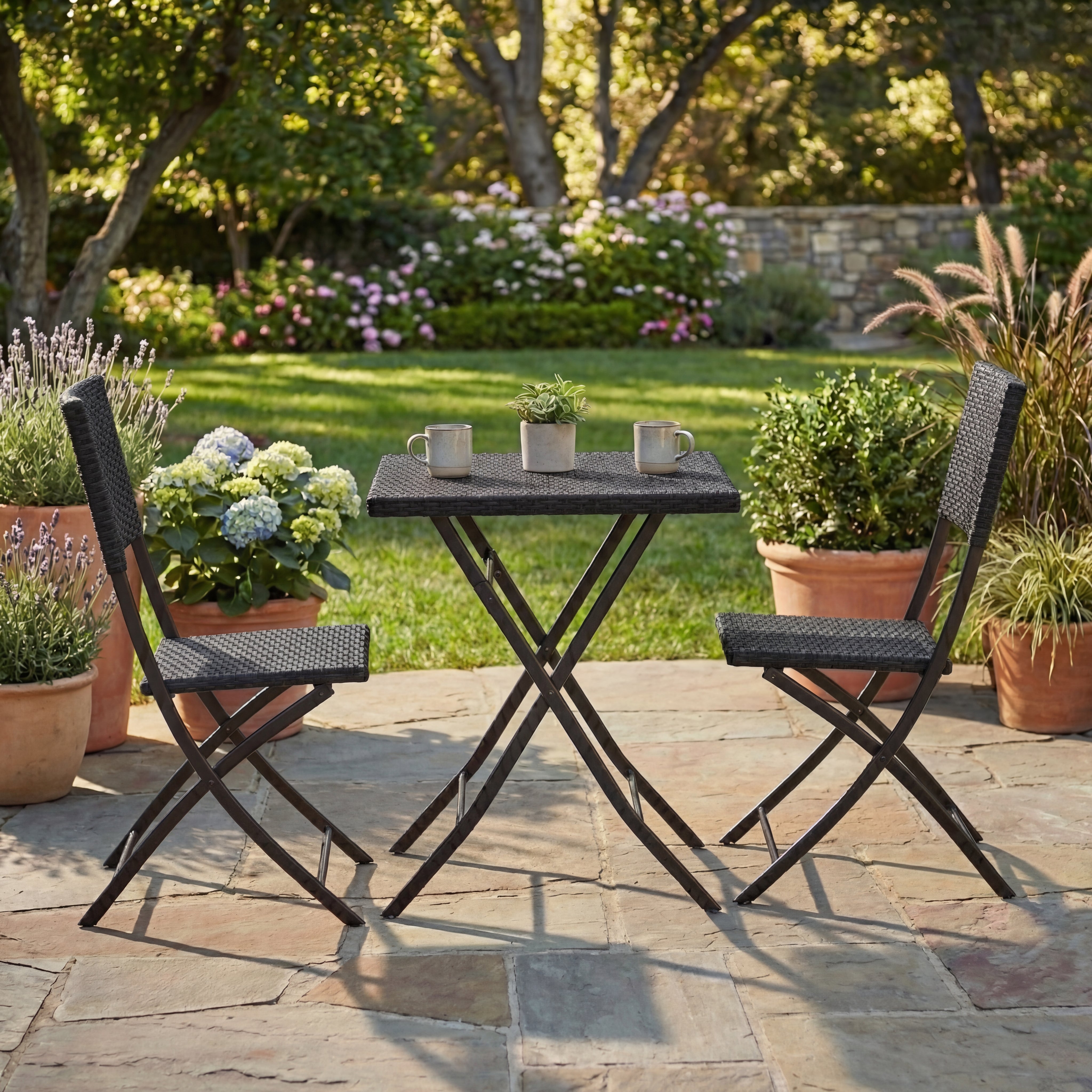 Designed with convenience in mind, the chairs and table feature a folding design, making them easy to store and transport. This makes the set ideal for small spaces like patios, balconies, and gardens, or for those who love to take their outdoor furniture on the go.