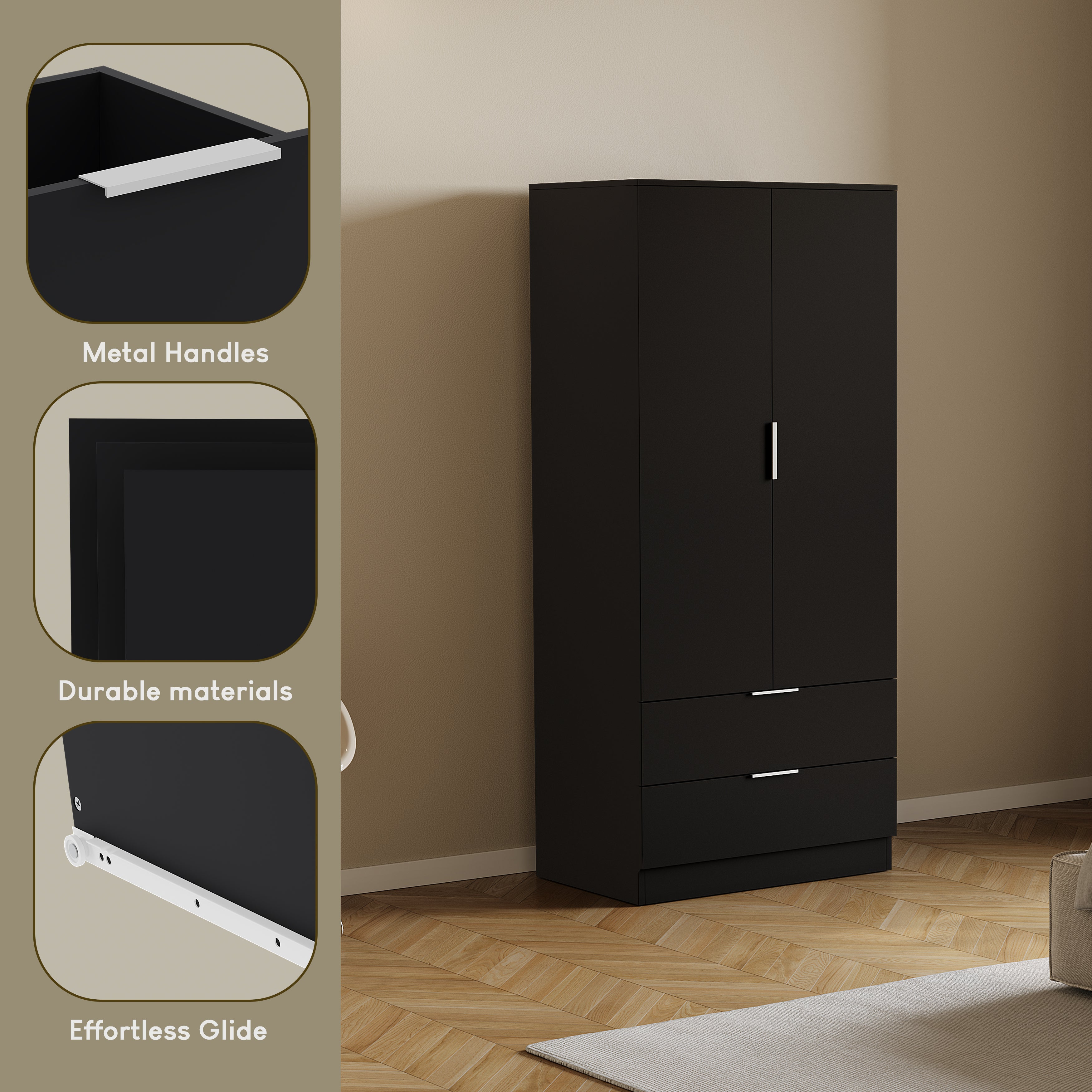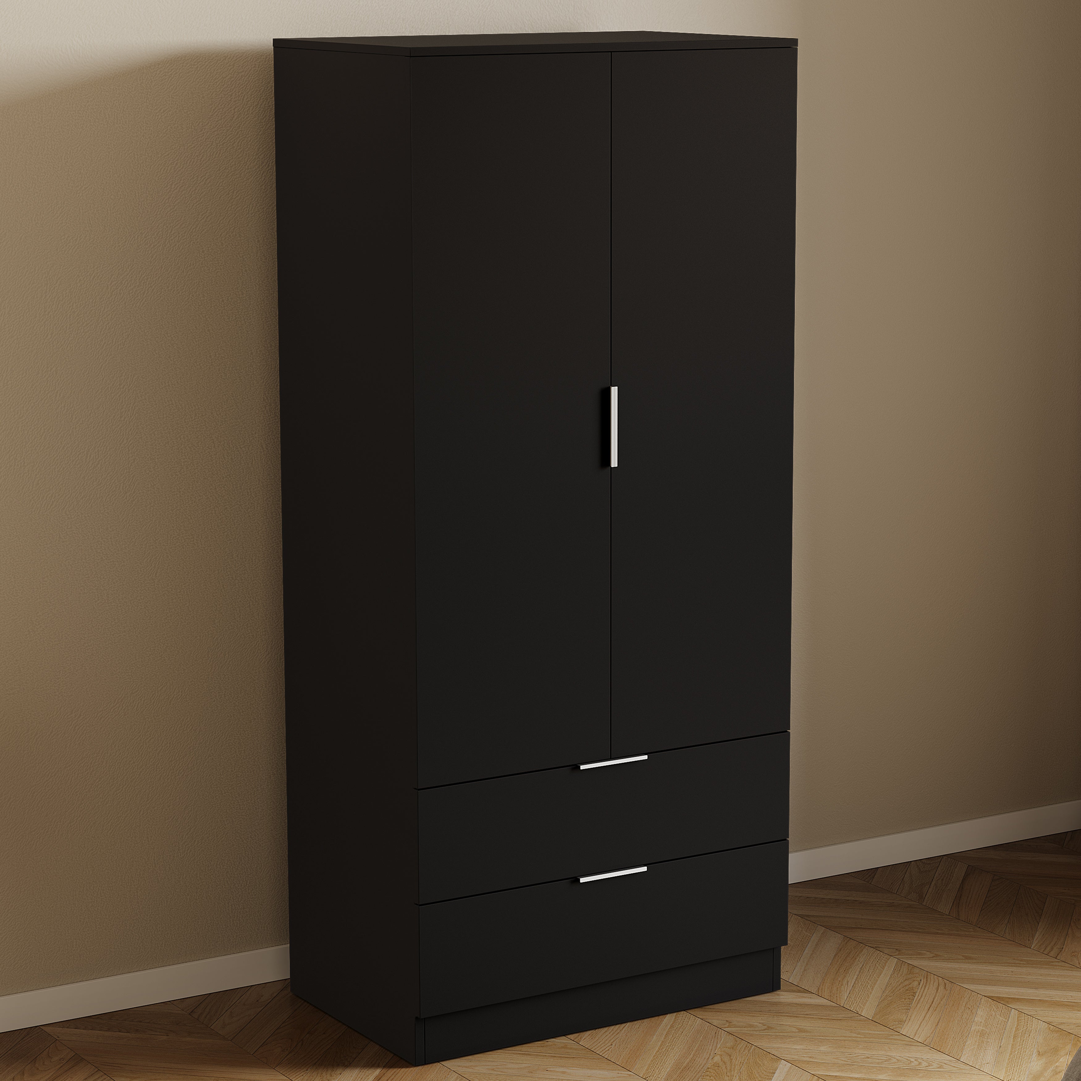 Behind the two doors, a full-length hanging rail provides ample space for coats, shirts, and longer garments, while an upper shelf is ideal for folded clothes, bags, or storage boxes. Two full-width drawers at the base glide smoothly on metal runners, offering convenient storage for loungewear, accessories, or everyday essentials.
