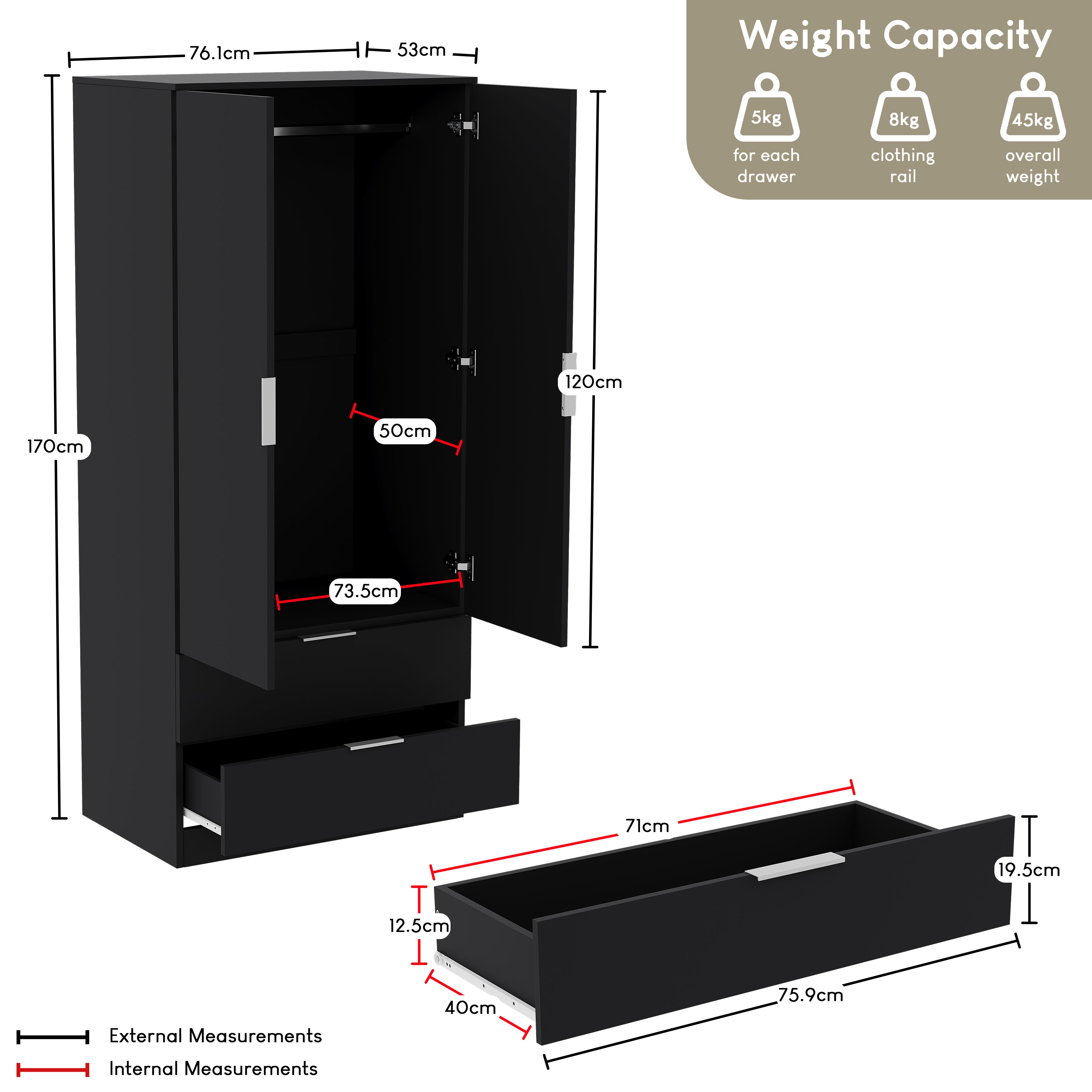 Weight Limit: 8kg Hanging Rail / 5kg Per Drawer