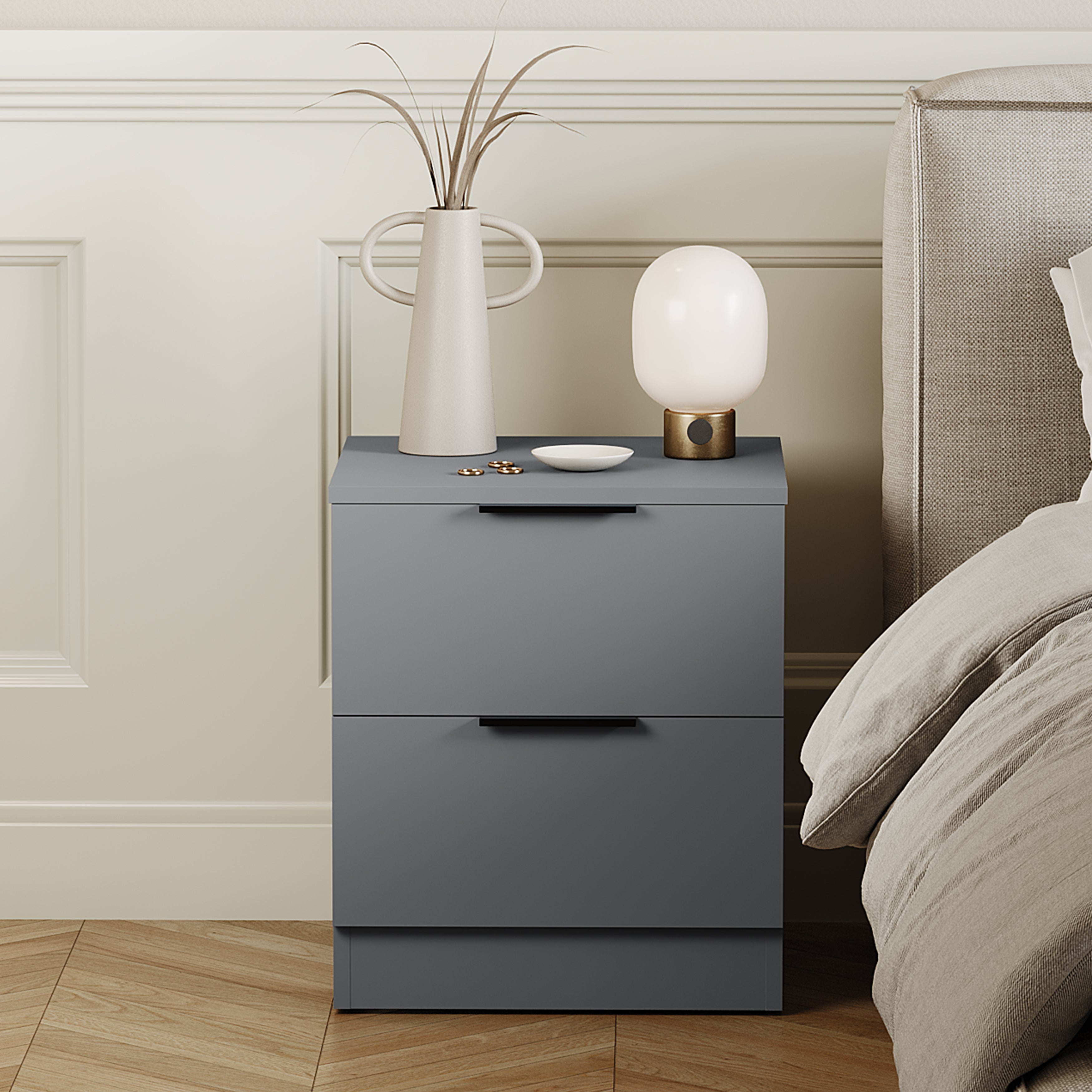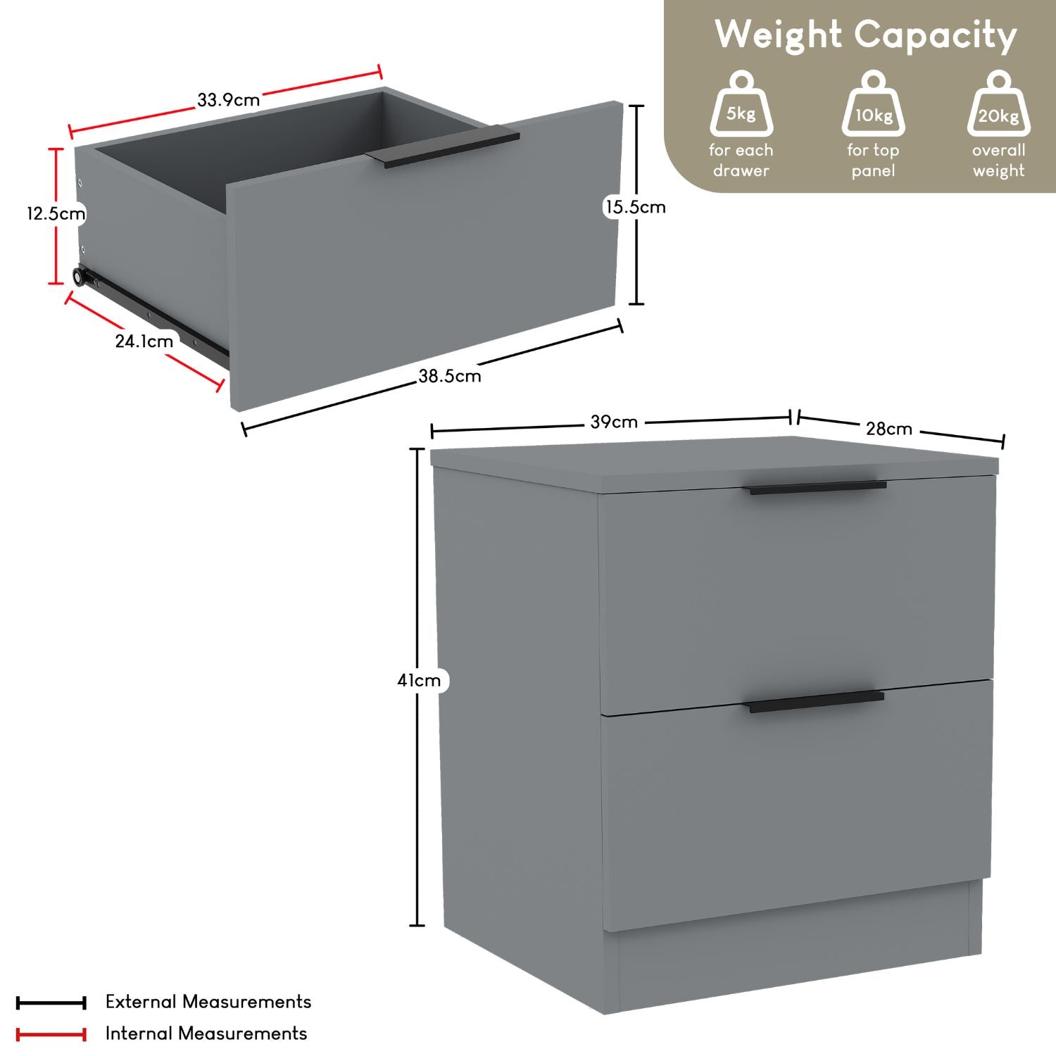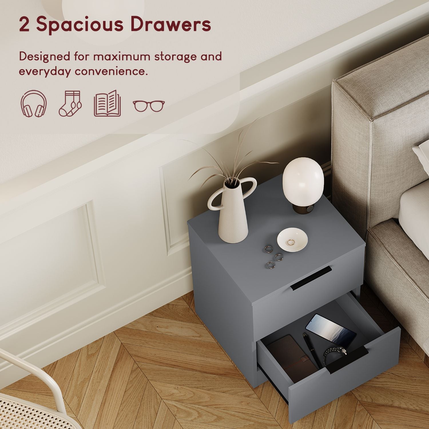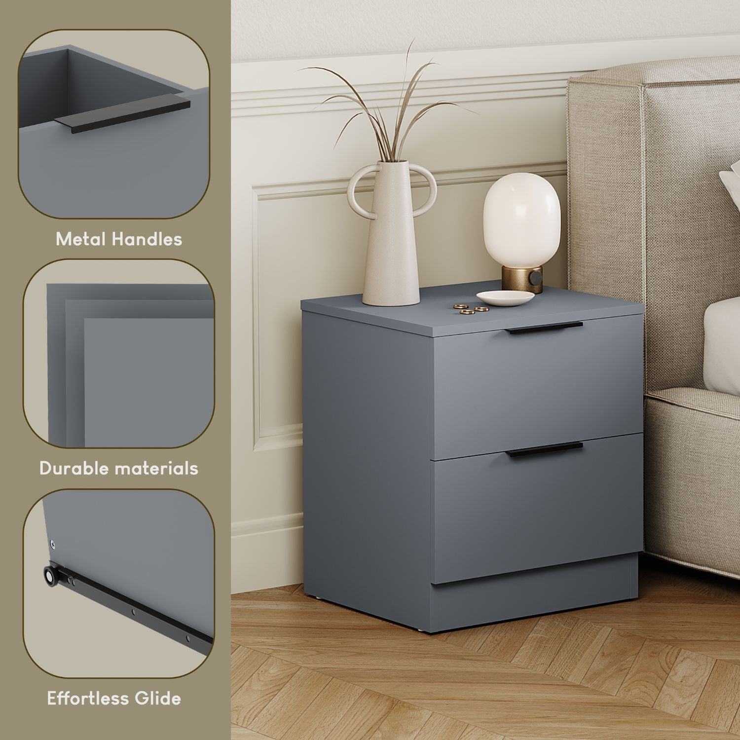 Each bedside cabinet features two smooth-glide drawers fitted with metal runners, offering easy access to essentials such as books, electronics, or personal items. Sleek handle detailing enhances the modern design, while the flat tops provide convenient space for lamps, alarm clocks, or nighttime accessories.