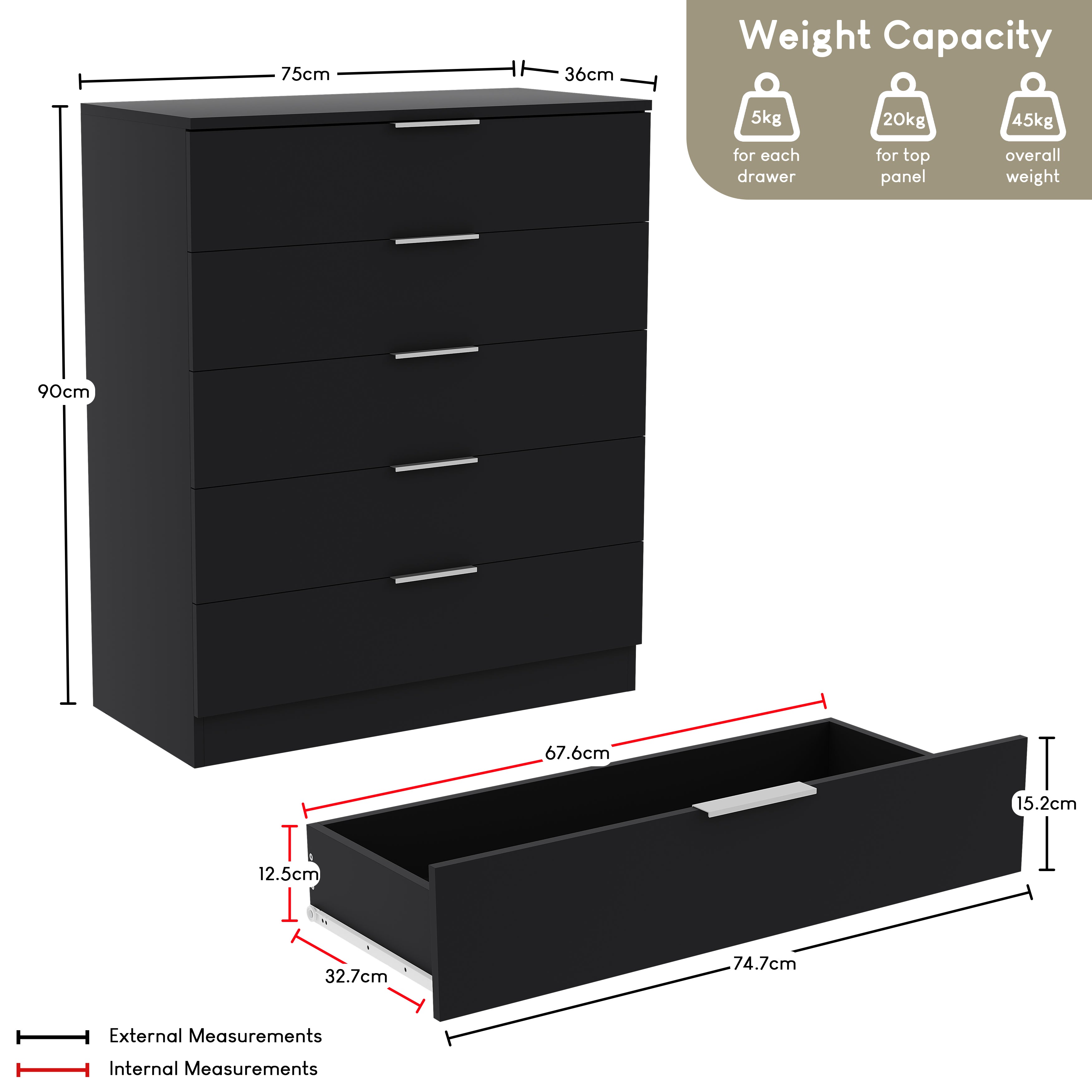 Weight Limit: Top Panel: 20kg / 5kg Per Drawer